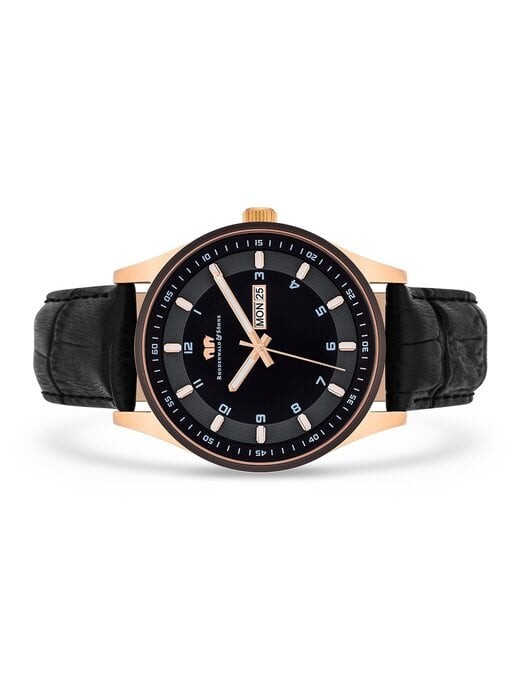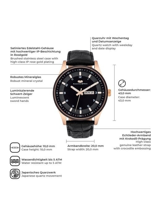 Вечная, функциональная и универсальная, эта модель мануфактуры Rhodenwald & Söhne заняла место в каждой коллекции часов. Продуманно спроектированные наручные часы избавлены от ненужных дополнительных функций и намеренно сводят дизайн к основным элементам часового механизма: линейные индексы с арабскими цифрами, стрелки-мечи, окружная минутная шкала и указатель даты — в центре внимания темного циферблата.