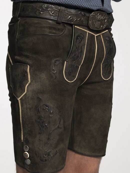 Эти кожаные брюки в деревенском стиле от Spieth & Wensky идеально подходят для торжественных случаев. Пуговицы и вышивка привлекают внимание, а также окантовка швов контрастного цвета. Пятнистый фон хорошо сочетается с различными нарядами, а пряжка в виде оленя на поясе придает изысканность. Козья кожа эластичная и качественная. Боковые карманы дополняют картину. В сочетании со стильной рубашкой и туфлями haferl вы привлечете внимание!
