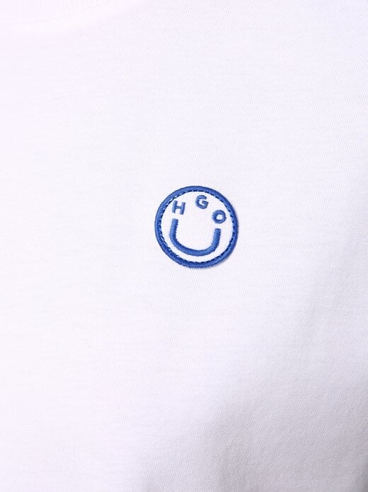 Милый трюк, который поднимет вам хорошее настроение: синяя футболка Hugo Vintage Tee_B_1 украшена небольшой нашивкой со смайликом.