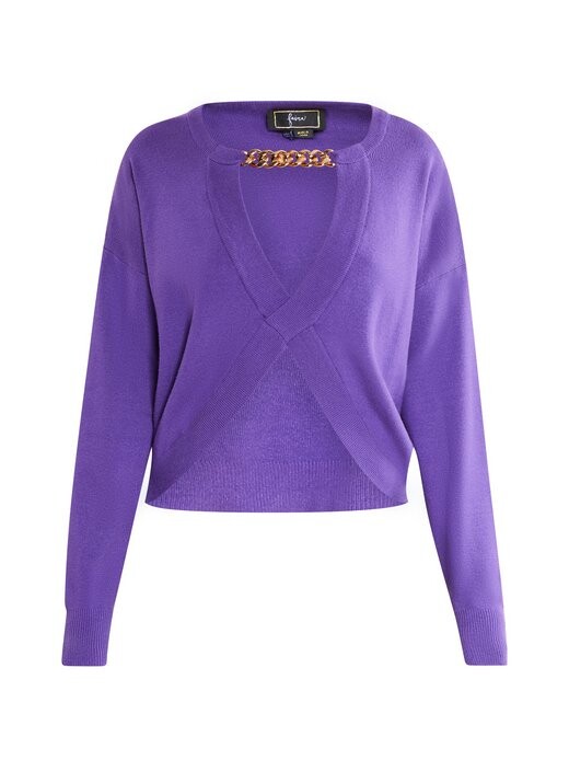 Необычное вязаное изделие от Faina придаст вам утонченный гламур. Тонкая смесь пряжи с содержанием вискозы балует вас, а круглый воротник украшен широкой золотистой цепочкой, еще больше подчеркивающей вырез на груди. Декоративный перекрёсток и фигурный низ спереди расставляют визуальные акценты. Благодаря технике укороченного кроя свитер прекрасно сочетается с джинсами с завышенной талией и туфлями-лодочками.