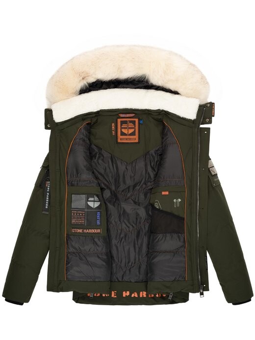 Современная мужская зимняя парка с большим капюшоном из искусственного меха (оба съемных) и теплым воротником из искусственного меха (также съемным) от нового бренда премиум-класса STONE HARBOR, а также изысканным металлическим логотипом на рукаве.