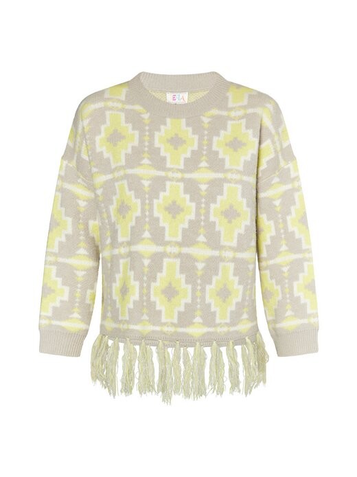Свитер от IZIA выполнен из мягкой пряжи, имеет свободный крой. Благодаря привлекательному этническому узору и бахроме по низу свитер быстро становится трендовой вещью зимнего сезона. Завершают дизайн манжеты, связанные резинкой.