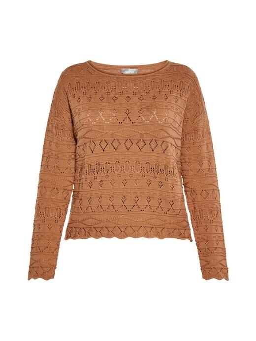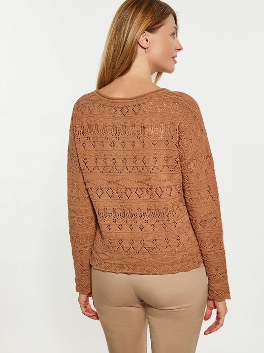 Представляем идеальное дополнение к вашему гардеробу: вязаный женский свитер. Этот ажурный свитер с круглым вырезом и длинными рукавами обеспечивает стиль и тепло. Схема вязания имеет симметричный дизайн со сложенными рядами, подчеркнутыми ромбами и геометрическими фигурами.