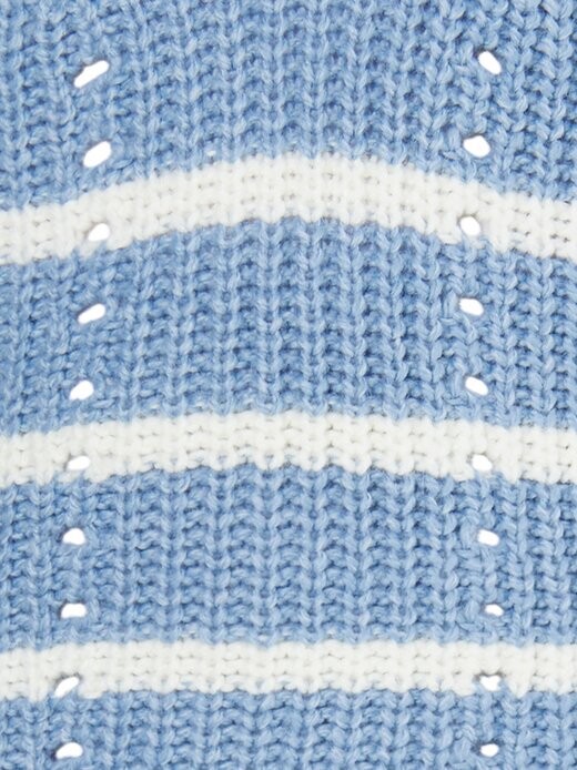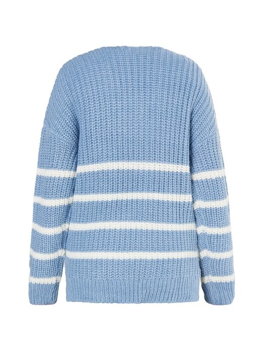 Этот свитер от usha BLUE LABEL, связанный крупной вязкой, с глубоким V-образным вырезом и интересными вязаными элементами с петельками, станет особенным зимним компаньоном. Модель выполнена из мягкой смесовой пряжи, полосы и ребристые манжеты дополняют морской образ.