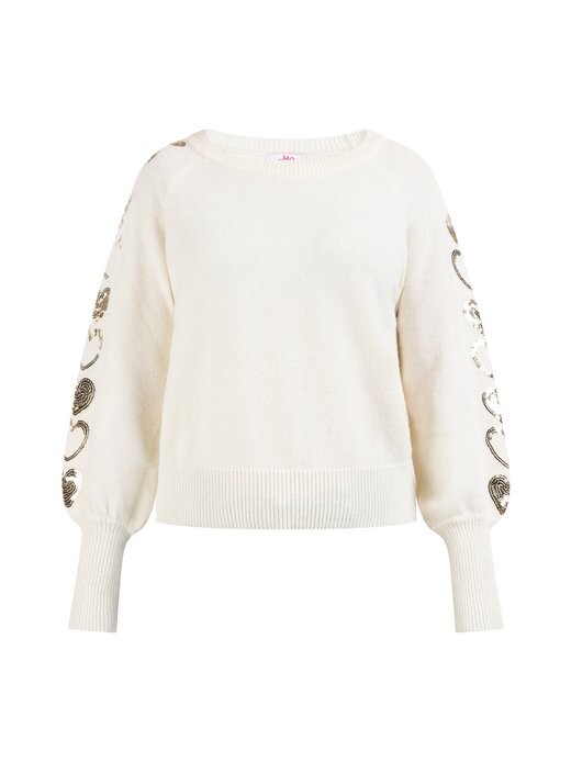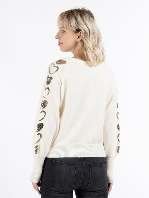 Золотое сердце! На рукавах даже вышиты несколько сердечек из пайеток золотого цвета. Это значит, что у нас есть свитер от myMo, который можно носить и днем, и вечером. Мягкая смесовая пряжа и широкие рукава реглан с длинными вязаными манжетами удачно дополняют красивый дизайн.