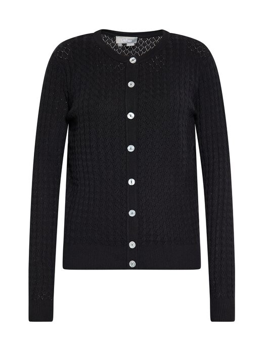 Женский кардиган, структура которого напоминает ромбовидные косички. Эта стильная модель имеет ребристый круглый вырез, длинные рукава с ребристыми манжетами и ребристый низ для дополнительного комфорта. Застежка спереди на блестящие пуговицы, что придает образу элегантности.
