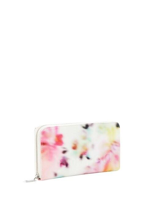 Большой прямоугольный женский кошелек бренда DESIGUAL с красочным размытым рисунком, рельефным полулоготипом и различными отделениями.