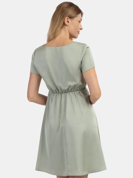Летнее платье из уши – наряд на все случаи жизни. Сделанная из шелковистого, блестящего и чудесно струящегося материала, вы всегда будете идеально одеты, как в офис, так и на летнюю вечеринку. Особое внимание привлекает женственный V-образный вырез с обтянутыми тканью пуговицами, короткие рукава и эластичная талия. Мягкая внутренняя подкладка дополняет элегантный дизайн.