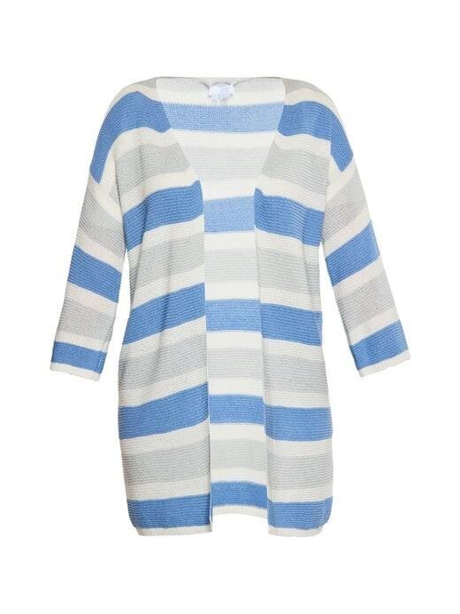 Представляем новинку в коллекции трикотажа: свитер свободного кроя с полосатым узором в широкие горизонтальные полосы. Драпированный вид создает непринужденную и комфортную атмосферу и идеально подходит для повседневной носки. Этот открытый кардиган с круглым вырезом и рукавами три четверти одновременно стильный и функциональный. Выполнено из мягкой пряжи с ребристой текстурой на манжетах, воротнике и подоле.