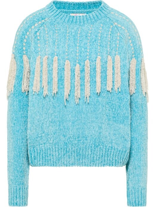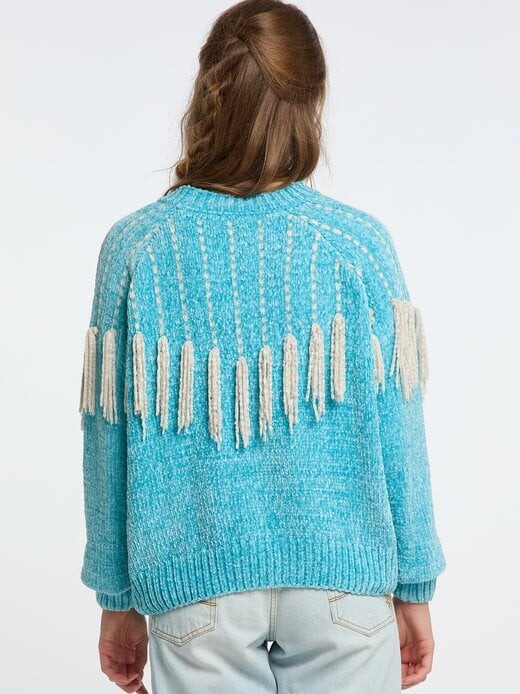 Бархатистая, мягко блестящая пряжа синель была разработана в свитере IZIA для создания экстравагантного ковбойского стиля в стиле поп-цвет. Модель свободного кроя впечатляет встроенной бахромой, рукавами реглан и ребристыми манжетами.