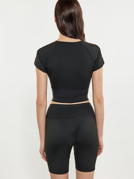Укороченный топ приталенного силуэта с короткими рукавами и круглым вырезом. Этот топ, изготовленный из гладкой и эластичной ткани, обеспечивает удобную посадку без ущерба для комфорта.