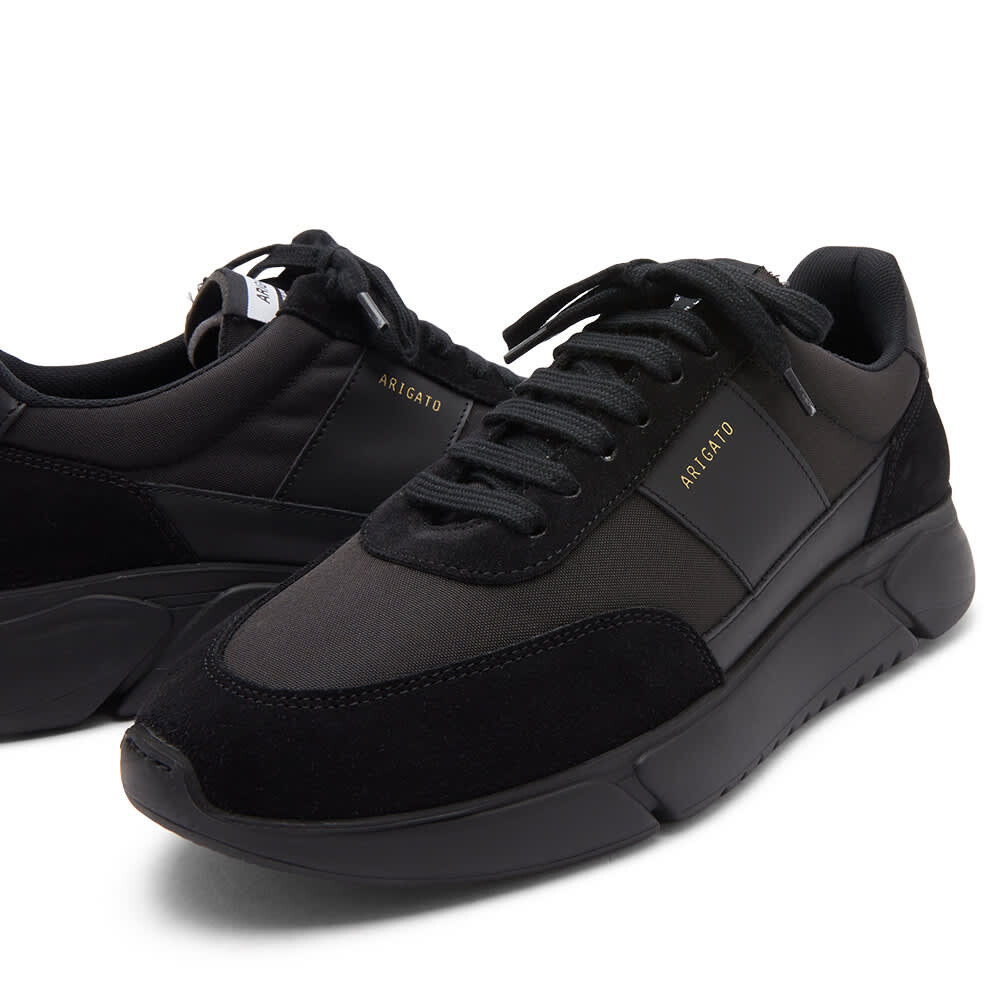 Кроссовки Genesis Monochrome от роскошного шведского лейбла Axel Arigato снова воплощают настоящий винтажный стиль в новом сезоне — на этот раз в полностью черном цвете. Они изготавливаются вручную в Португалии из роскошного сочетания кожи, замши и текстиля, полученного из переработанных бутылок и морского пластика, и сидят на массивной мягкой подошве. Золотистый брендинг украшает боковые стенки в фирменной отделке Arigato.