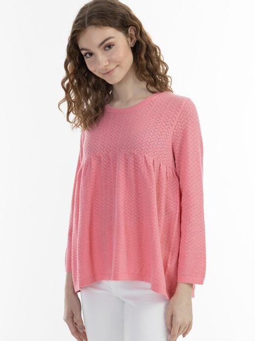 Свитер от myMo выполнен из смеси материалов с содержанием вискозы и имеет современный крой-тунику. Благодаря нежному узору структуры отверстий модель пастельного цвета поражает своим игривым шармом. Модный дизайн завершает круглый вырез.
