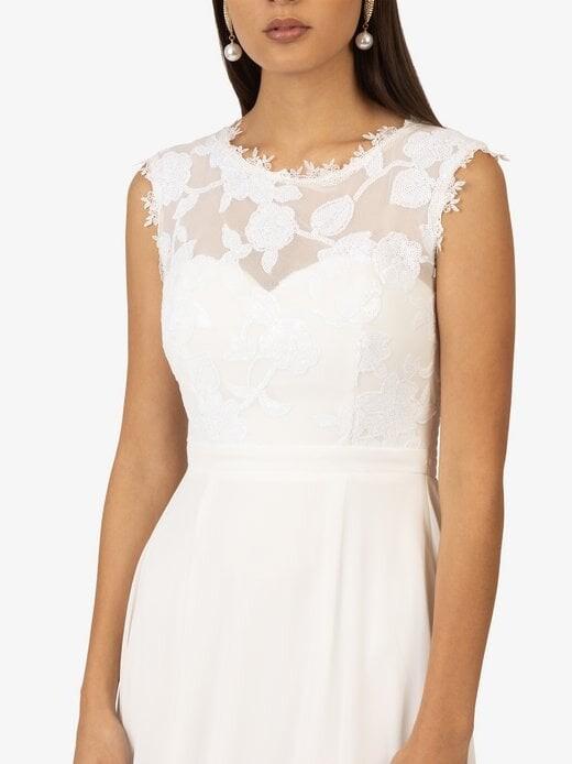 Элегантное вечернее платье с верхом из сетки с частично прозрачным спереди кружевом. Кружево декорировано пайетками. Верх отделен от струящейся шифоновой юбки поясом на талии. Задняя часть топа присборена под кружевом с вырезом и поэтому эластична, обеспечивая идеальную посадку.