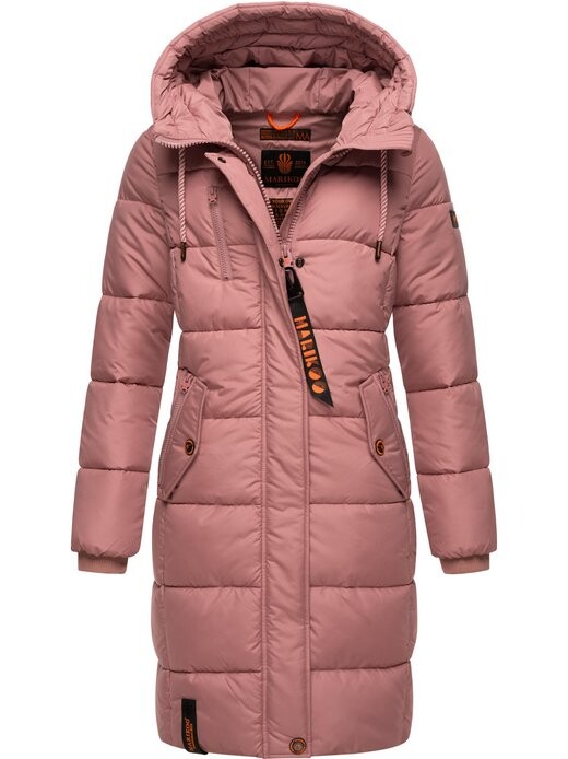 Длинное женское стеганое пальто с длиной верха чуть выше колен, удобным большим капюшоном и контрастными цветными элементами от бренда Marikoo.