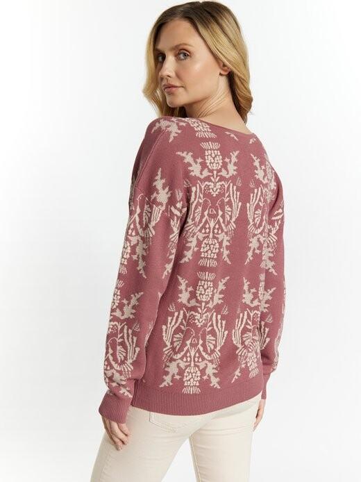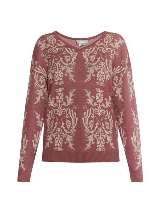 Узор интарсия в виде цветов и птиц по всей поверхности придает свитеру из уши очень индивидуальный вид. Модель из мягкой вискозной пряжи и ребристой вязки идеально впишется в новый сезон. Женственный V-образный вырез и небрежный вырез на плечах делают его желанным спутником любого зимнего образа.