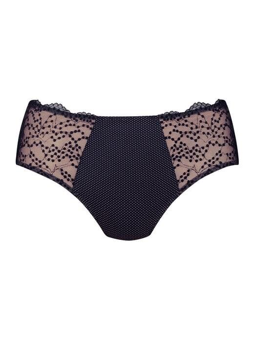 Модные и детализированные трусы Orely на талии очаровывают игривым шармом французского горошка. Нежная вышивка на тюле по бокам придает образу легкость и нотку чувственности.