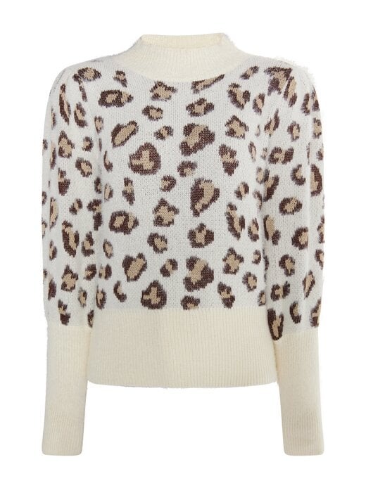 С помощью леопардовых вставок и пушистой пряжи с бахромой вы сможете заявить о себе в серые осенние и зимние дни. Женственный свитер имеет воротник-стойку в рубчик, слегка игривые рукава-буфы и длинные манжеты в рубчик по низу и рукавам, которые создают чудесный объем.