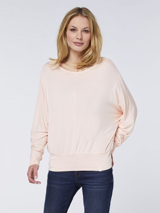 Яркая базовая мода со стильной ноткой: женская рубашка DETTO FATTO с длинными рукавами из мягкой смеси вискозы и эластана V-образного силуэта. Рукава «летучая мышь», разделительные швы и контрастный низ придают простому образу особый эффект.