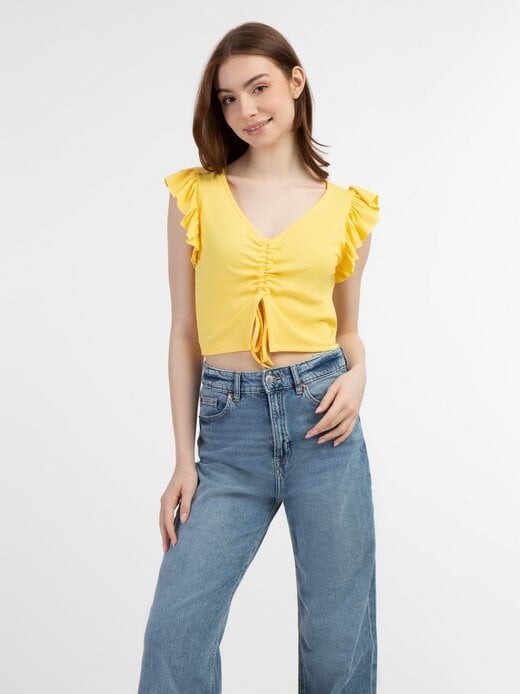Укороченная рубашка myMo, сделанная в Италии, выполнена в летней цветовой палитре. Укороченные рукава с рюшами и сборка по центру с завязкой придают этой трикотажной рубашке в рубчик невесомость.