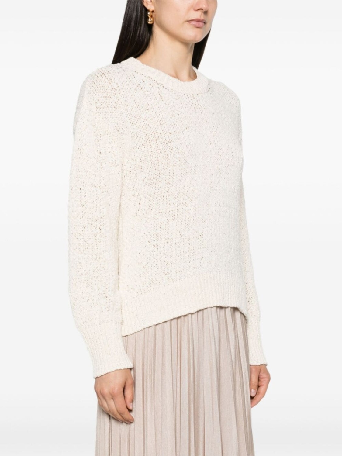 Смесовый хлопок цвета слоновой кости, 3D-вязка, круглый вырез, заниженная линия плеча, длинные рукава, ребристые манжеты и нижний край.
