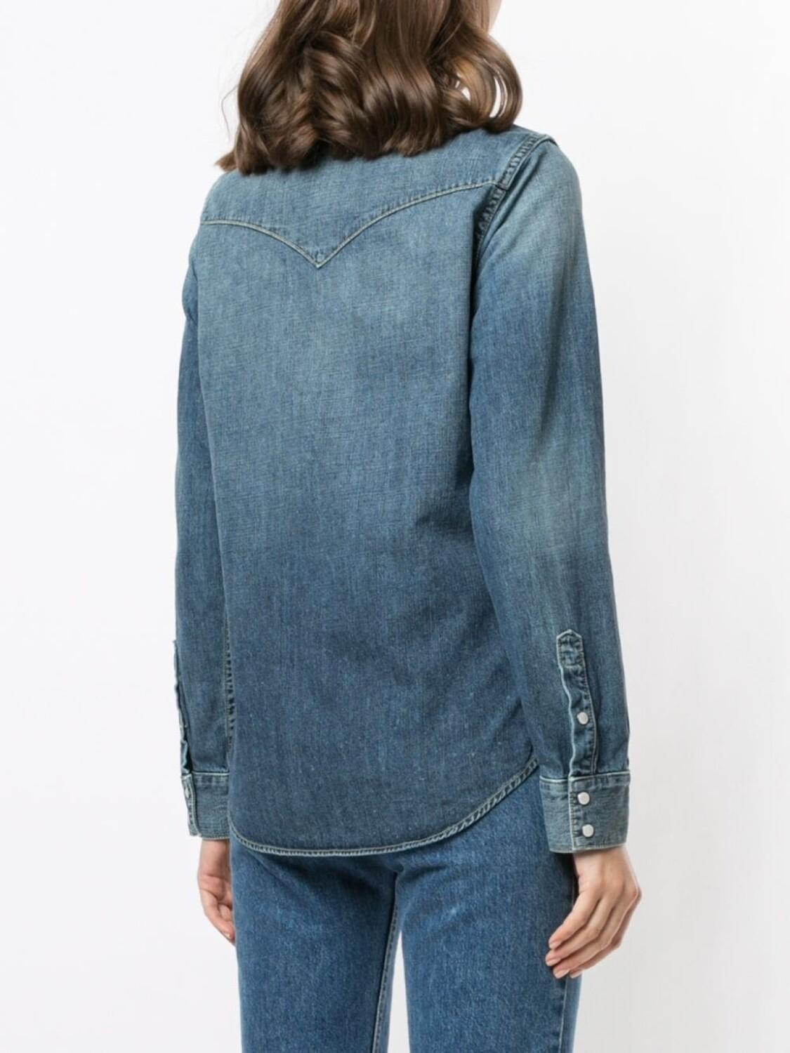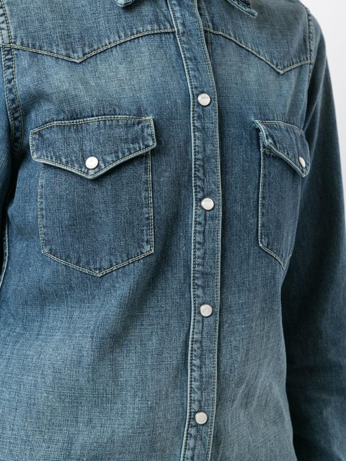 Модель из обработанного денима, прошитые края, классический воротник, застежка на пуговицах спереди, длинные рукава, манжеты на пуговицах и два передних кармана с клапанами.