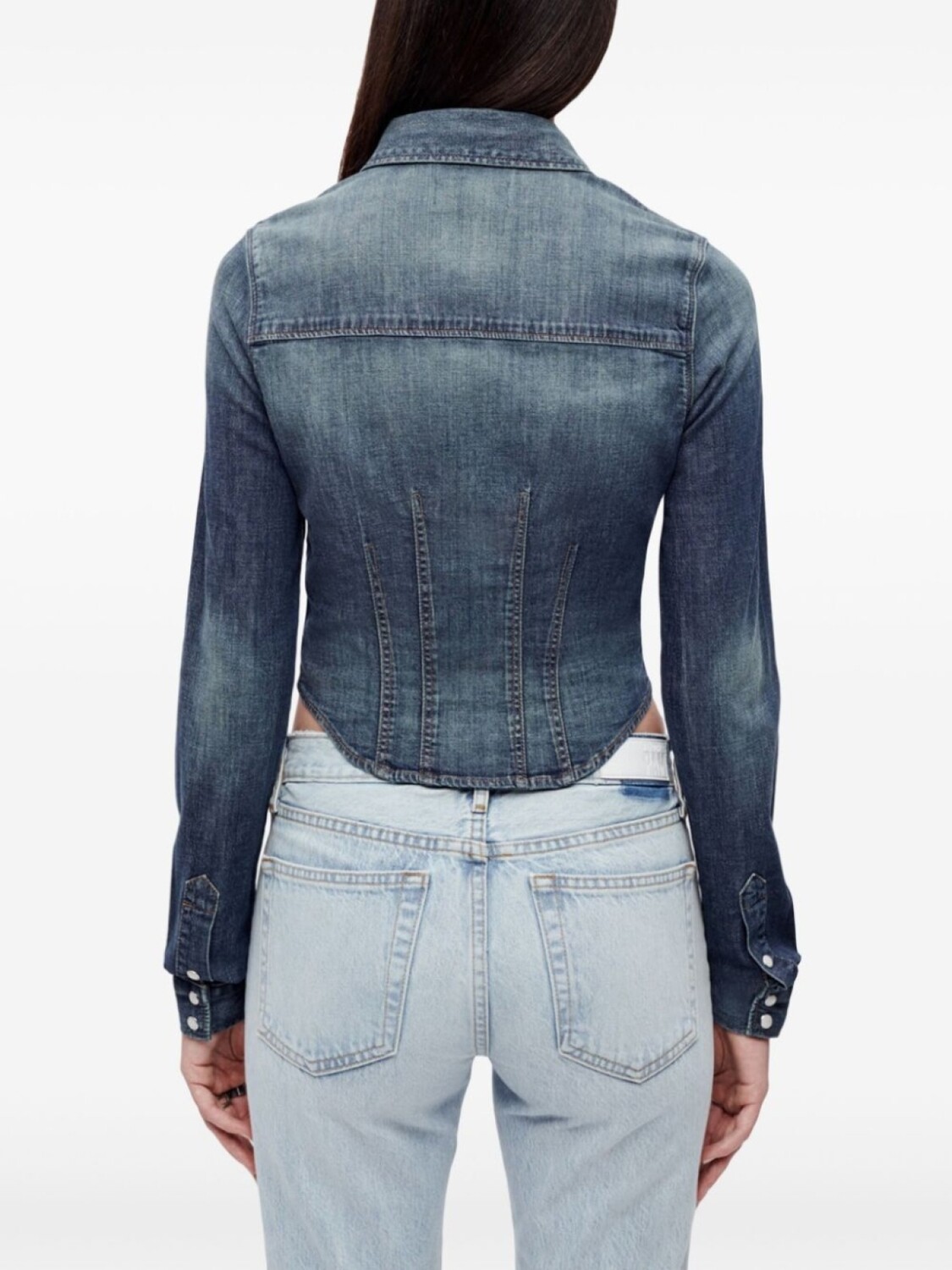 Индиго, хлопок, обработанный деним, верх в корсетном стиле, классический воротник, застежка на кнопках спереди, длинные рукава, манжеты с застежкой на кнопки, закругленный подол, Этот товар как минимум на 50% состоит из переработанных материалов. Мы рекомендуем стирать вещи из переработанных синтетических тканей в специальном мешке, чтобы микропластик не попадал в сточные воды., Узнать больше о том, какие товары получают отметку «Ответственный выбор», можно здесь.