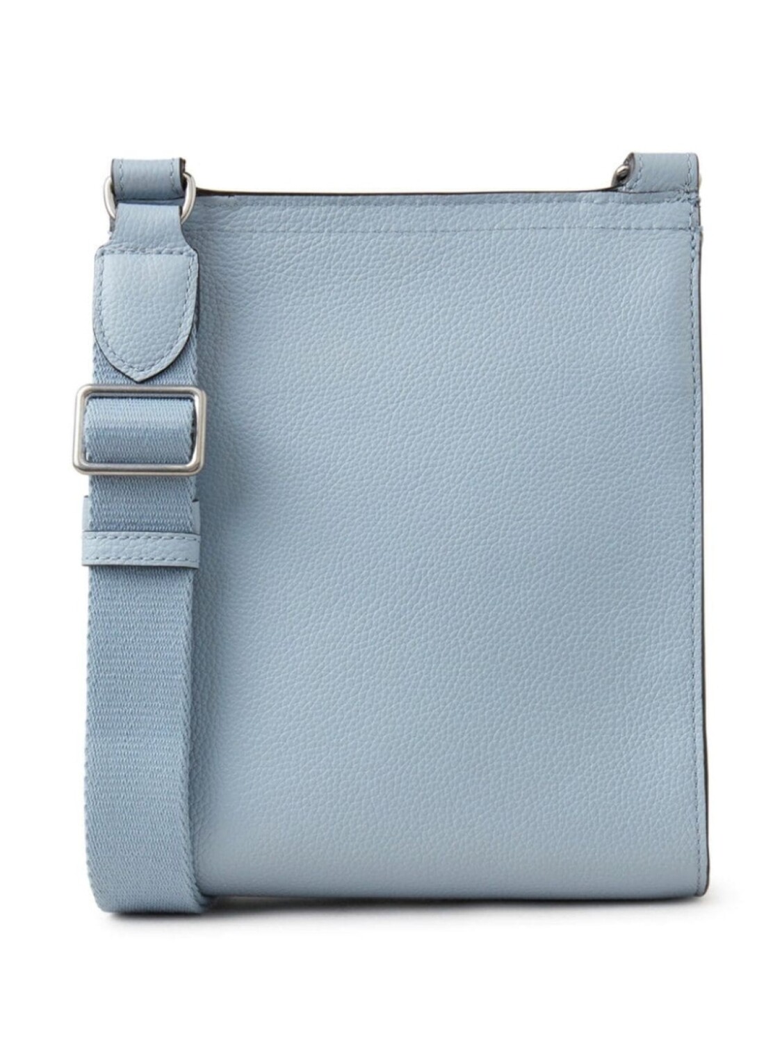 Голубой, телячья кожа, зернистая текстура, серебристая фурнитура, откидной верх, застежка с поворачивающимся замком, регулируемый ремень на плечо, прорезной карман спереди, основное отделение, тисненый логотип внутри, контрастная подкладка
