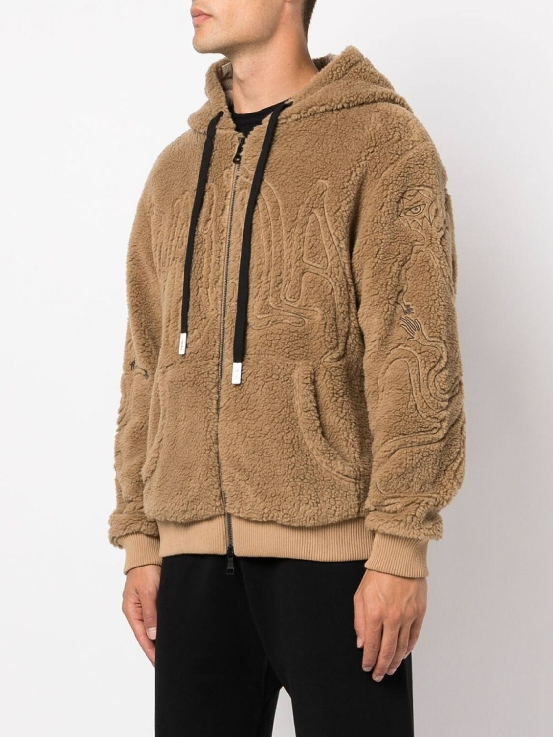 Коричневый, отделка из шерпы, вышитый логотип спереди, затягивающийся на шнурок капюшон, застежка на молнии спереди, длинные рукава, прямой подол, отделка в рубчик и карман-муфта.
