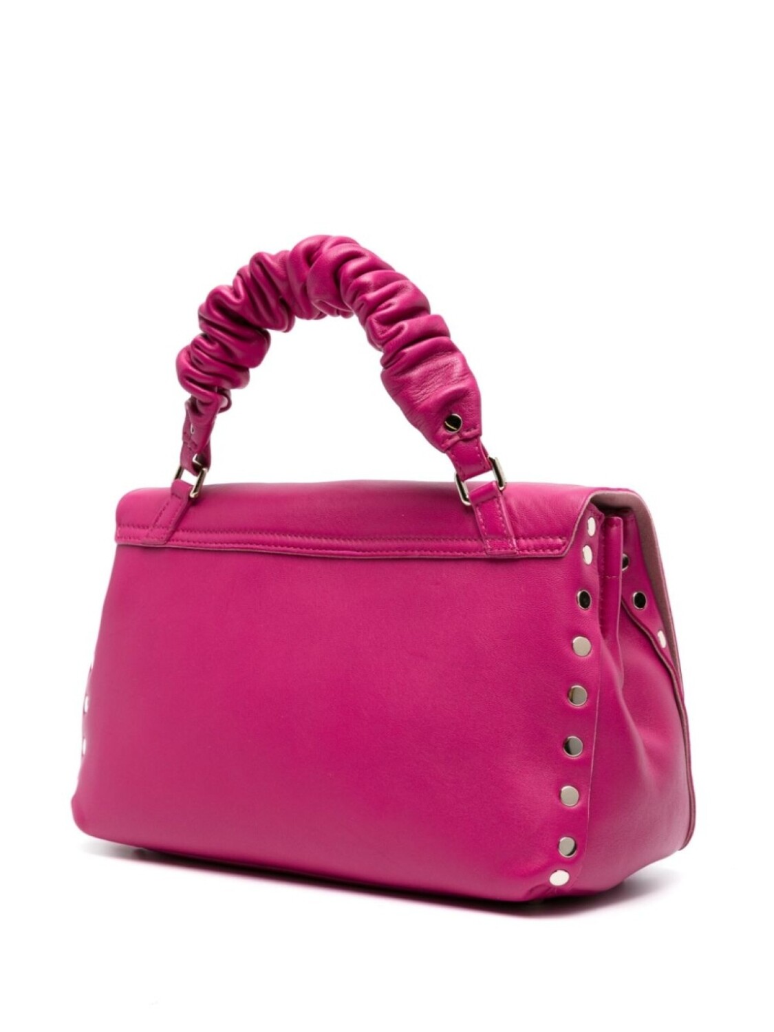 Фуксия, телячья кожа, золотистые заклепки, золотистый металлический логотип, золотистая фурнитура, нашивка с логотипом внутри, несколько отделений, внутренний карман на молнии, откидной клапан, застежка с поворотным замком и съемный ремень на плечо.
