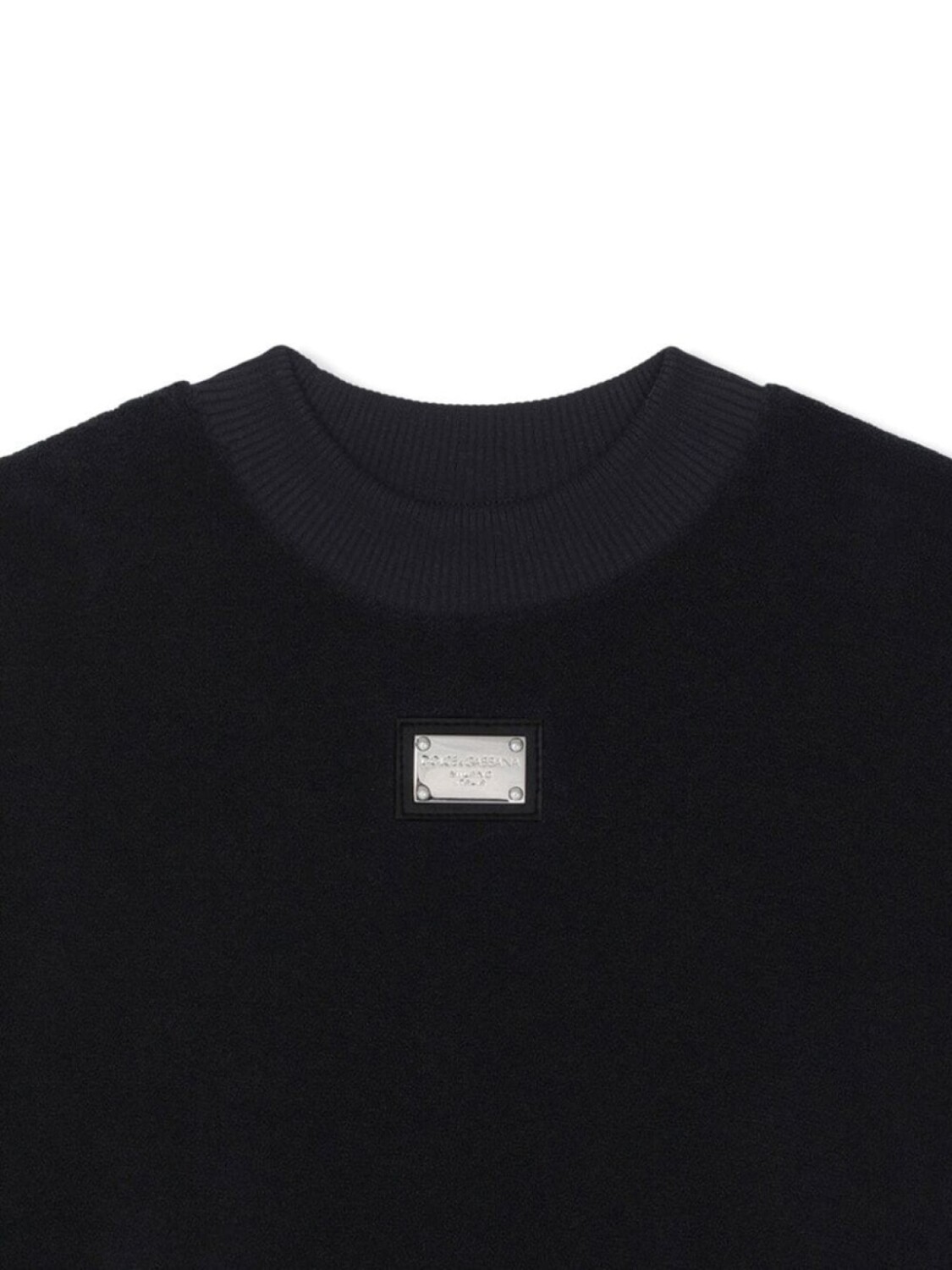Металлический логотип, круглый вырез, длинные рукава и подол в рубчик.