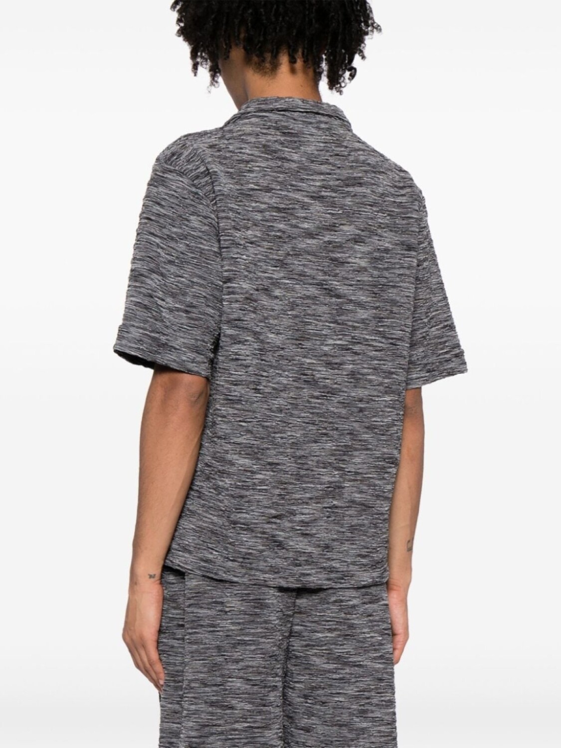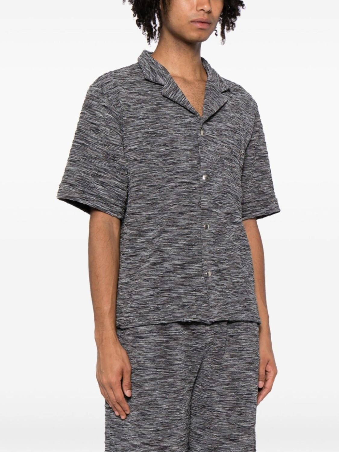 Подробнее о товаре: Серый, смесовый переработанный полиэстер, эффект меланж, серебристый металлический логотип, зазубренные лацканы, V-образный вырез, застежка на пуговицах спереди, нагрудный накладной карман, короткие рукава и прямой подол. . Узнать больше о том, какие товары получают отметку «Ответственный выбор», можно из материала «Как мы оцениваем экологичность и этичность».