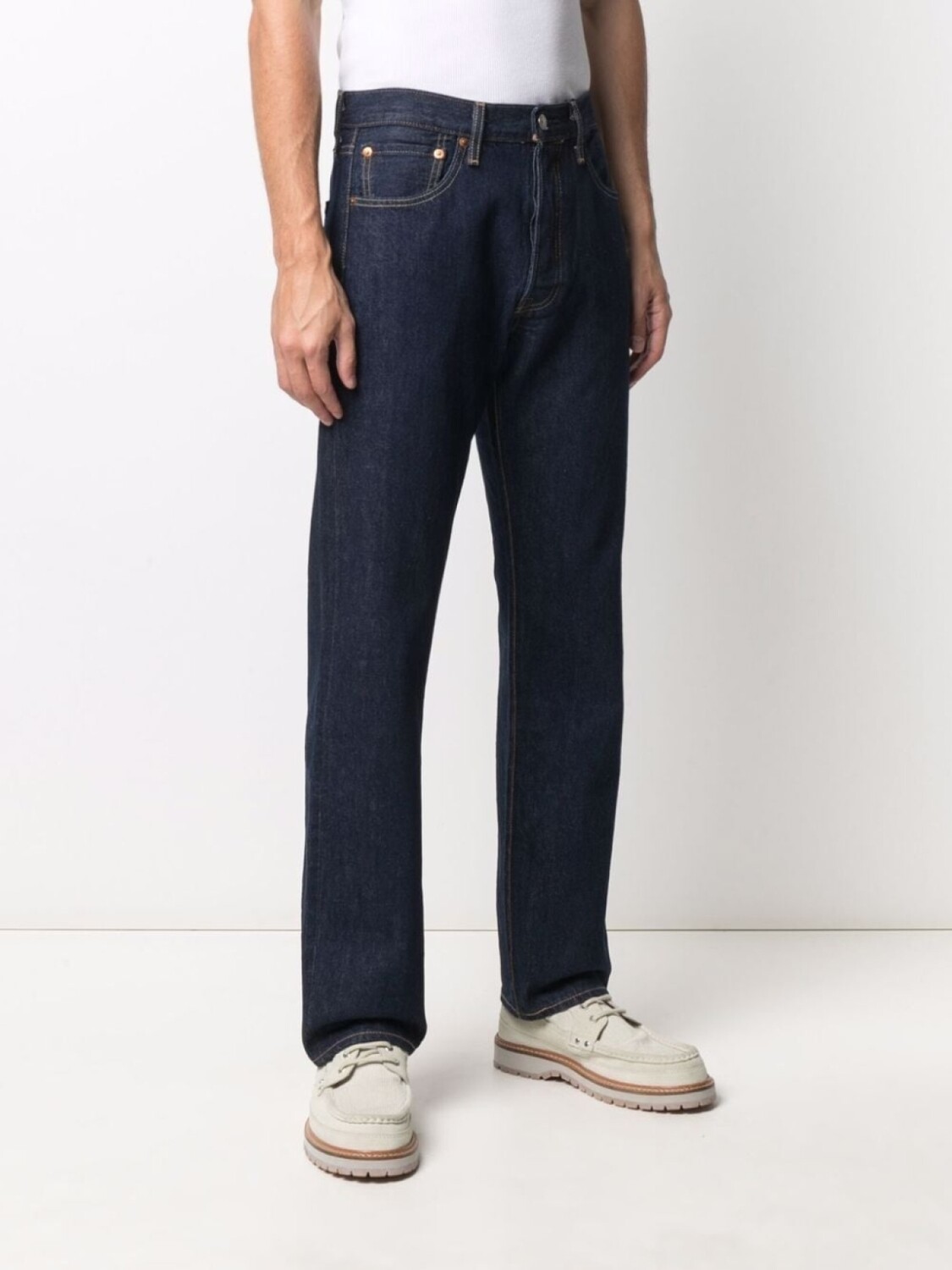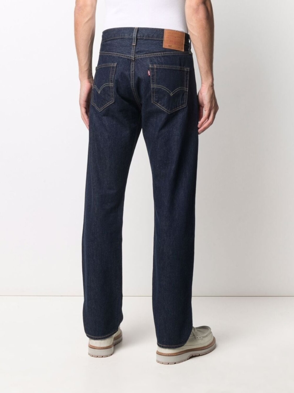 Контрастная строчка, петли для ремня, нашивка с логотипом сзади, прямой крой, ширинка на пуговицах и классическая пятикарманная модель.