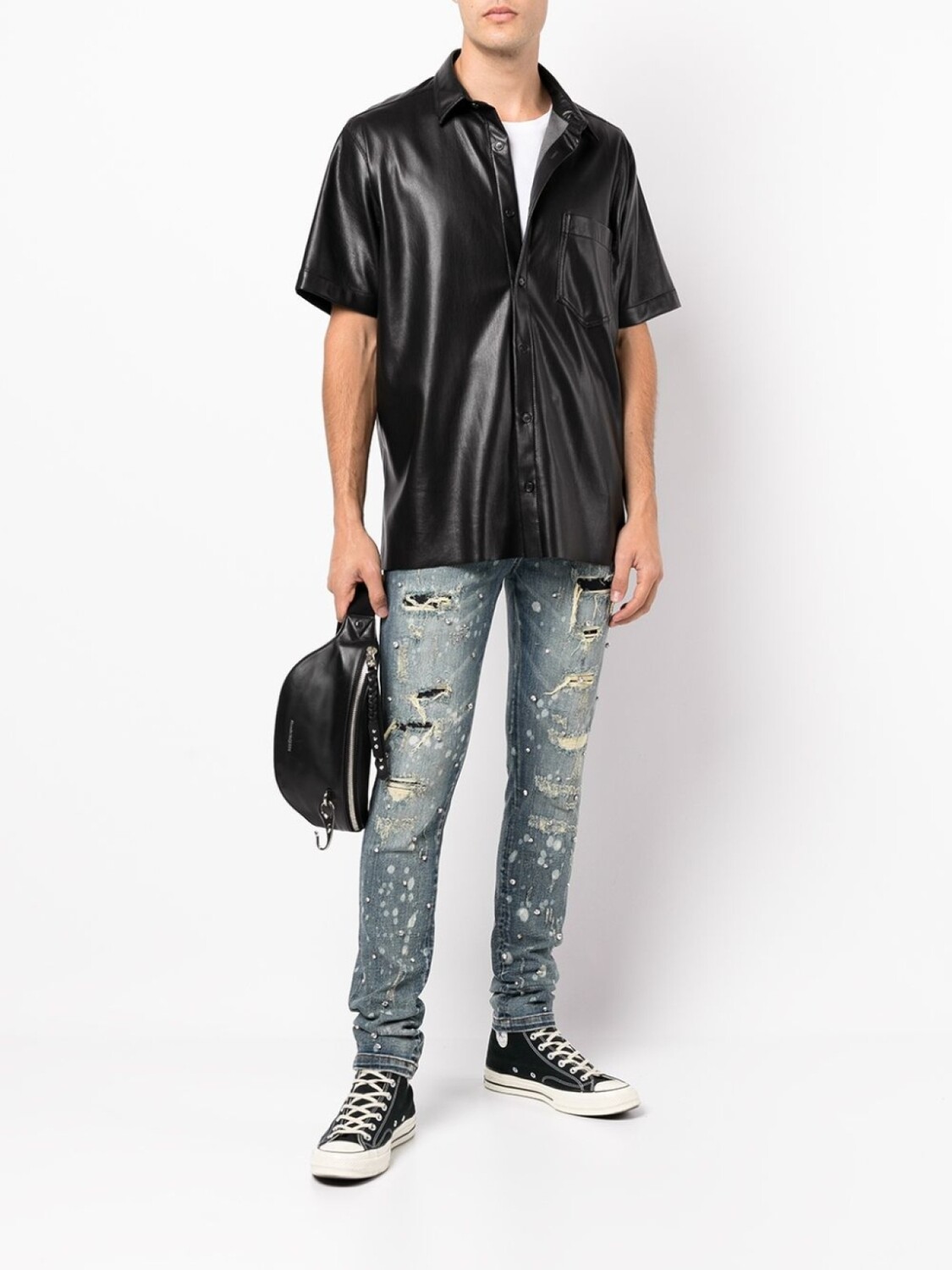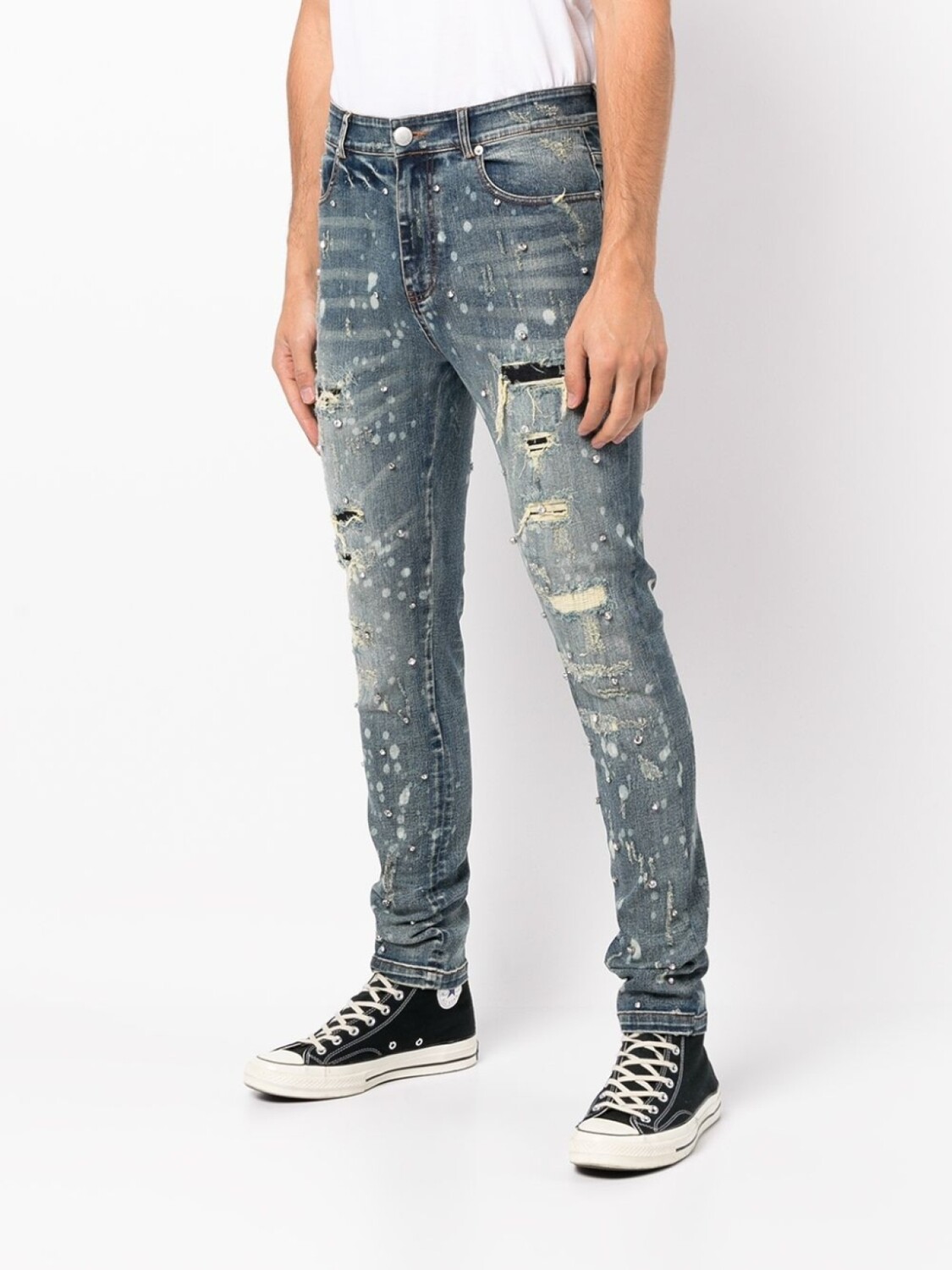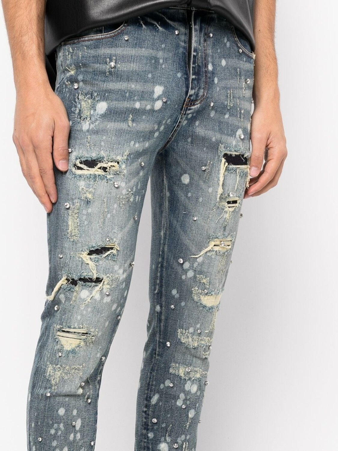 Эластичный хлопок, эффект потертости, модель с прорезями, эффект потертости, декор из кристаллов, кубический цирконий, нашивка, декоративные складки, застежка на молнии и пуговице спереди, петли для ремня, классическая пятикарманная модель и облегающий крой.