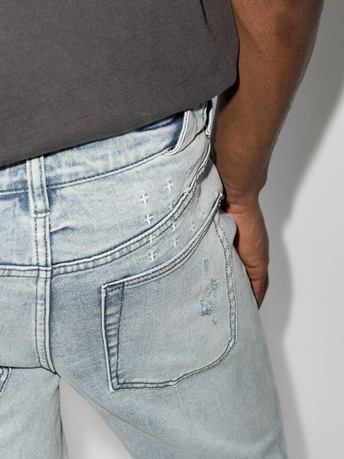 Модель с прорезями, эффект потертости, петли для ремня, низкая посадка, застежка на пуговицах спереди, узкий крой и классическая пятикарманная модель.