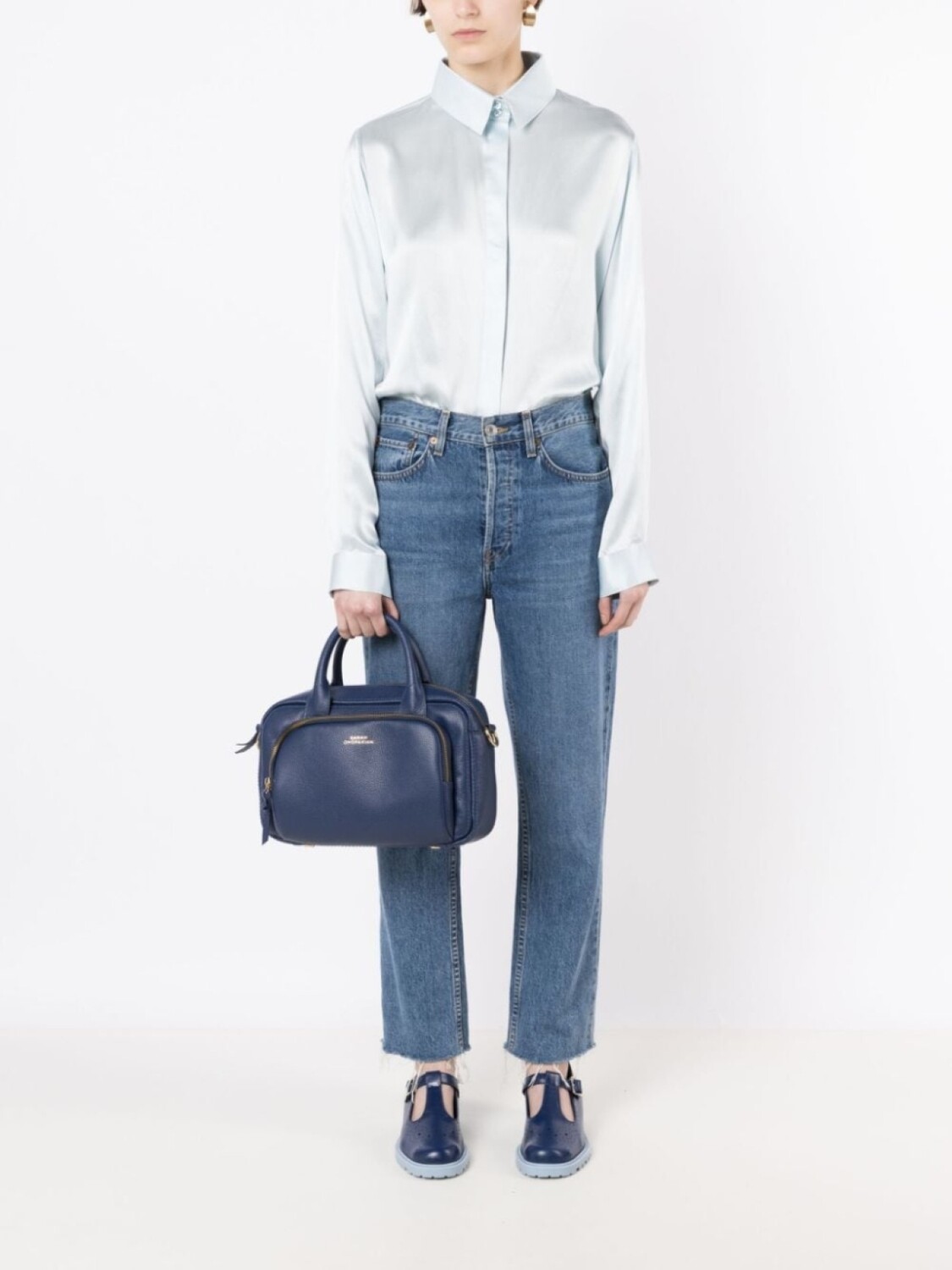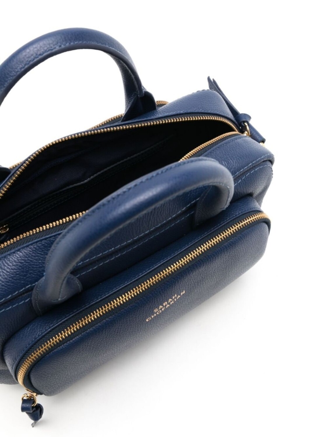 Темно-синий, кожа, зернистая текстура, золотистая фурнитура, логотип спереди, две закругленные верхние ручки, съемный регулируемый ремень на плечо, застежка на молнии сверху, основное отделение, внутренний карман на молнии и накладной карман на молнии спереди.