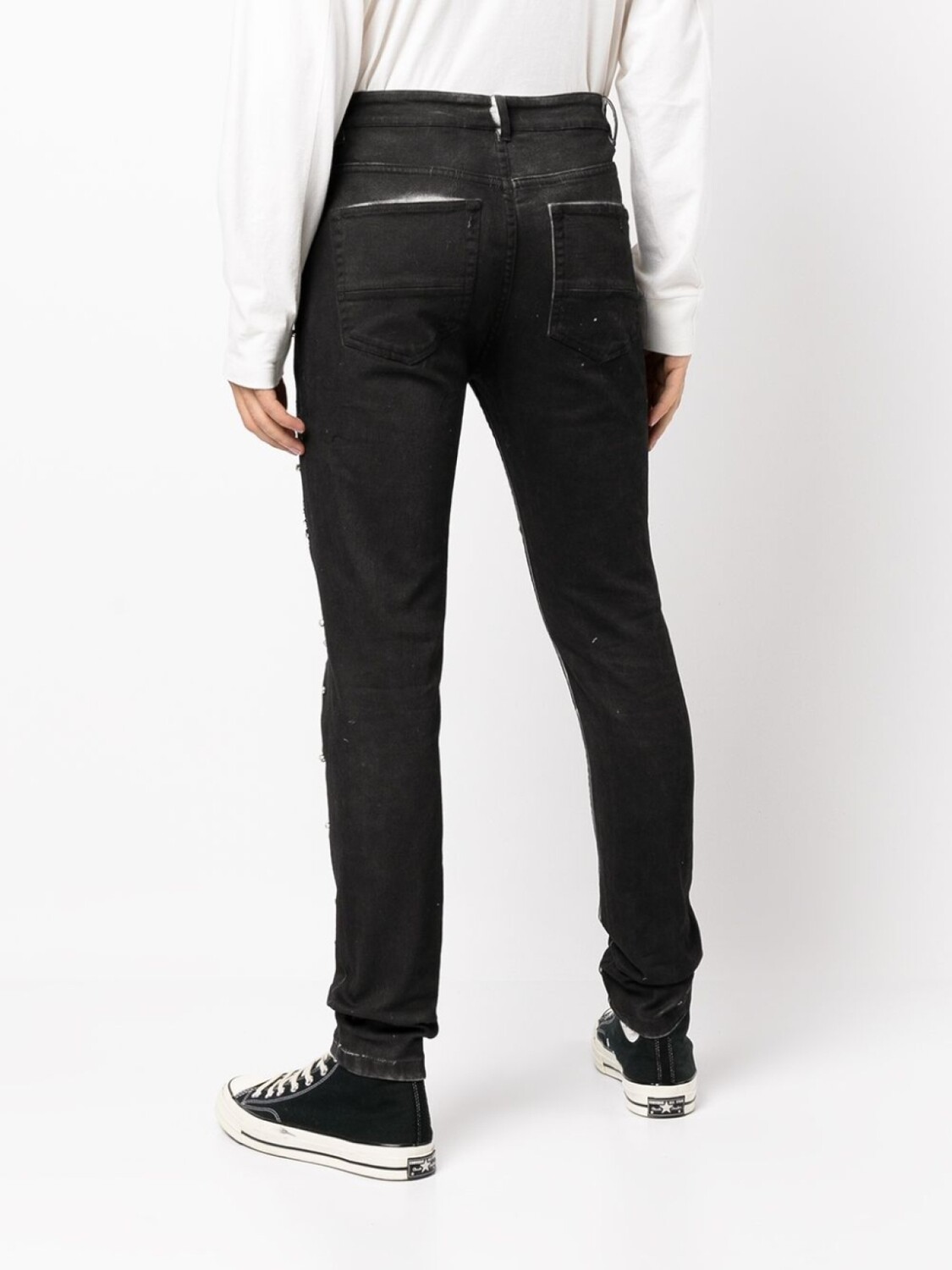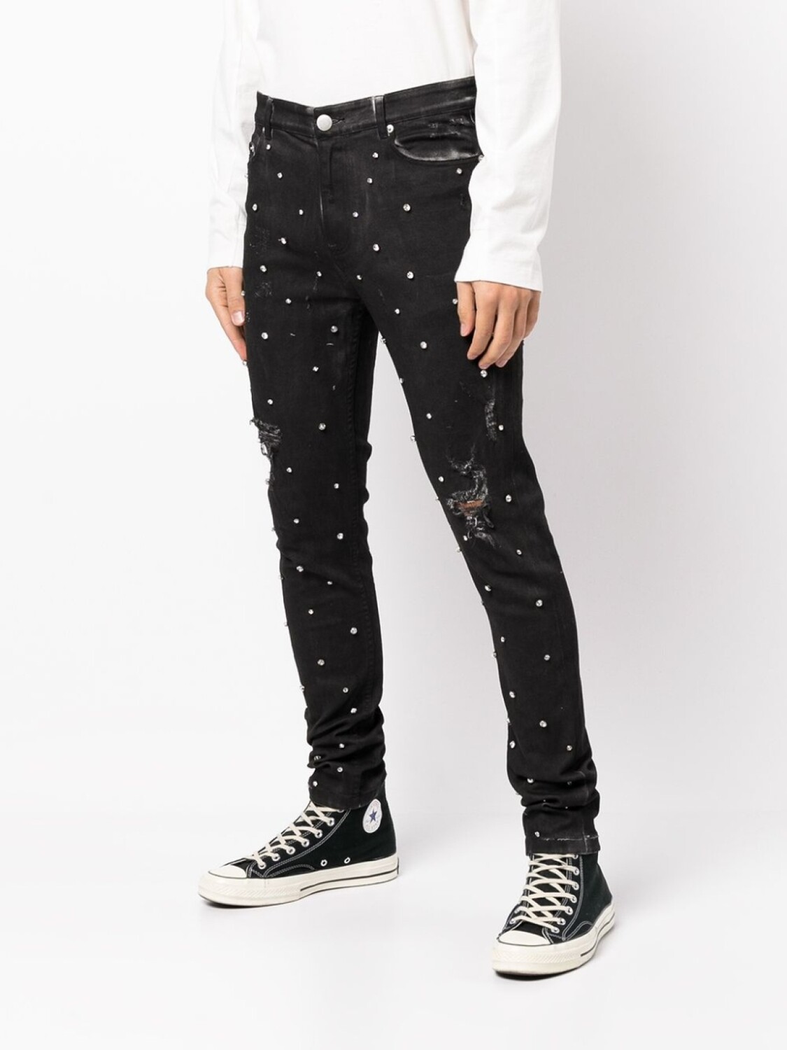 Эластичный хлопок, окрашивание готовой вещи по технологии garment dye, модель из обработанного денима, эффект потертости, декор из кристаллов, кубический цирконий, застежка на молнии и пуговице спереди, петли для ремня, классическая пятикарманная модель и облегающий крой. Цвет: синий.
