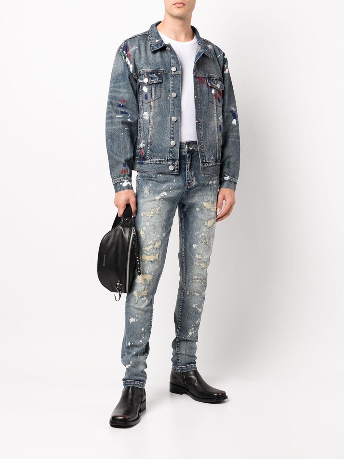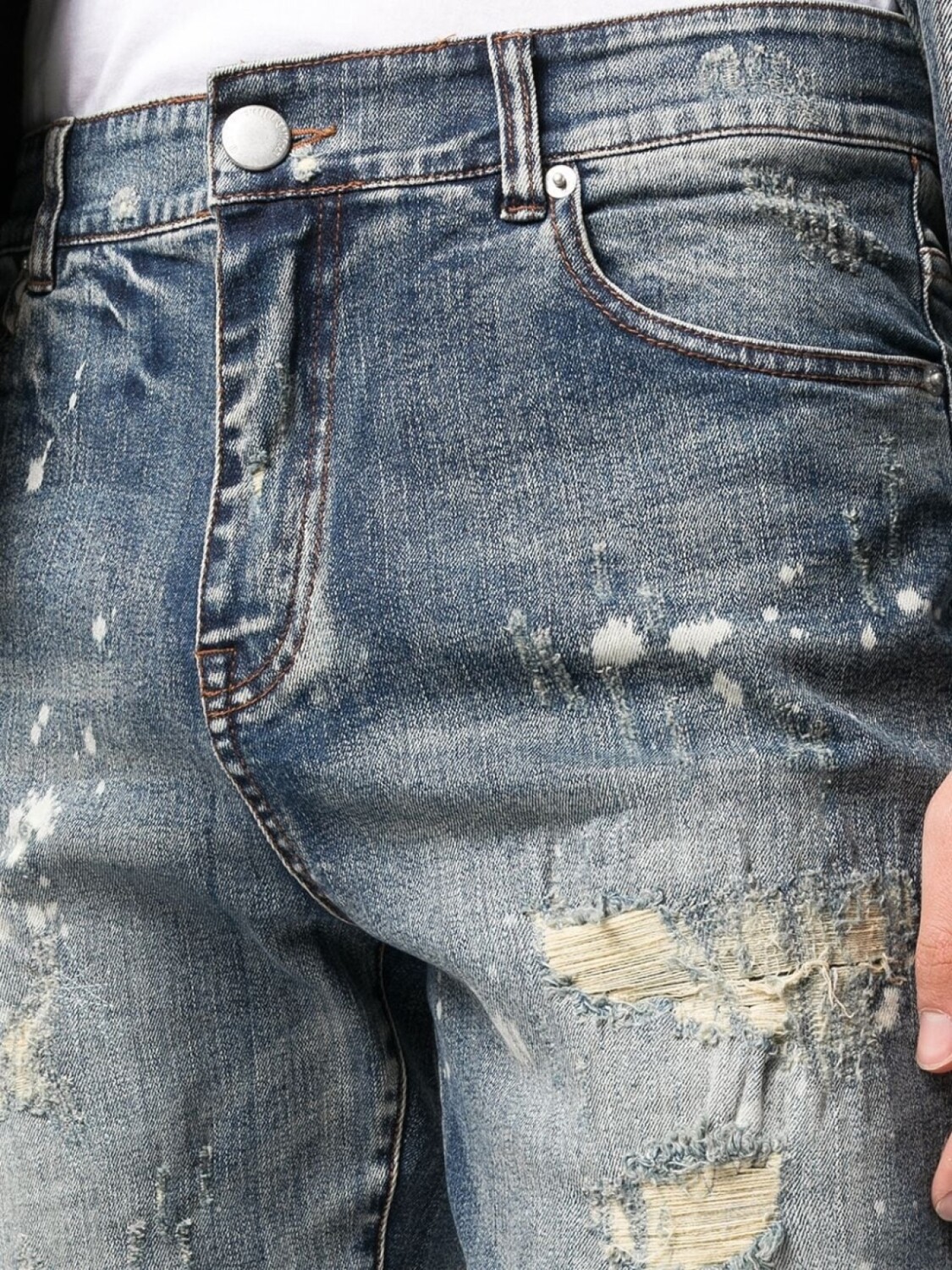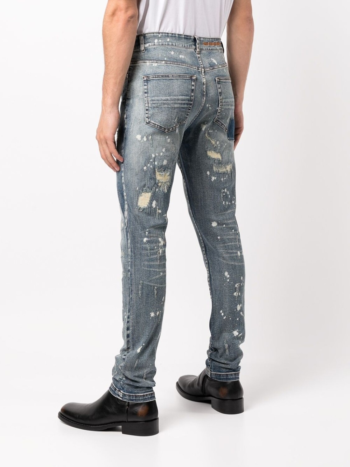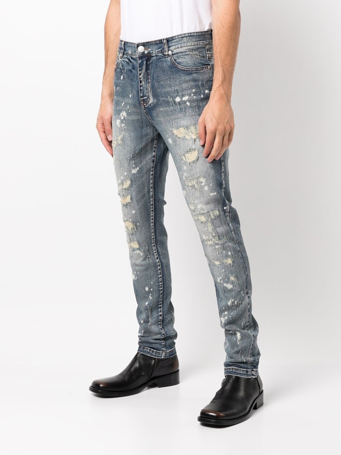 Модель с прорезями, эффект потертости, средняя посадка, петли для ремня, застежка на молнии и пуговице спереди, классическая пятикарманная модель и облегающий крой.