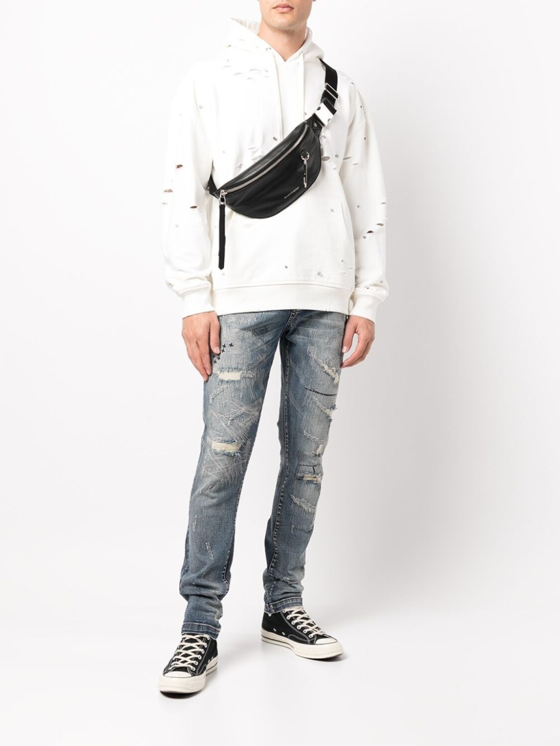 Эффект потертости, модель с прорезями, средняя посадка, петли для ремня, застежка на молнии и пуговице спереди, классическая пятикарманная модель и облегающий крой.