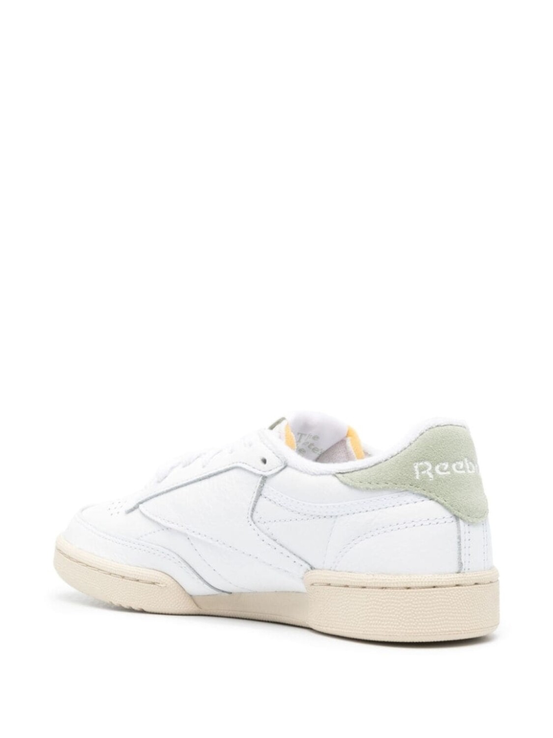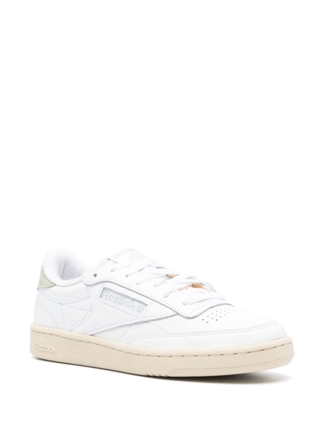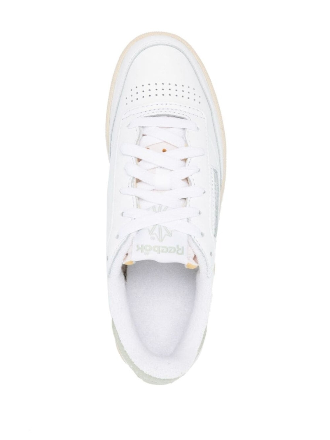 Телячья кожа оптического белого цвета, текстура с галькой, круглый носок, перфорированный носок, вырез логотипа, вышивка логотипа сбоку, нашивка с логотипом на язычке, контрастный фирменный каблук, мягкая лодыжка, съемная стелька, подкладка из французского махра, логотип на подошве, плоская резиновая подошва, шнуровка спереди.