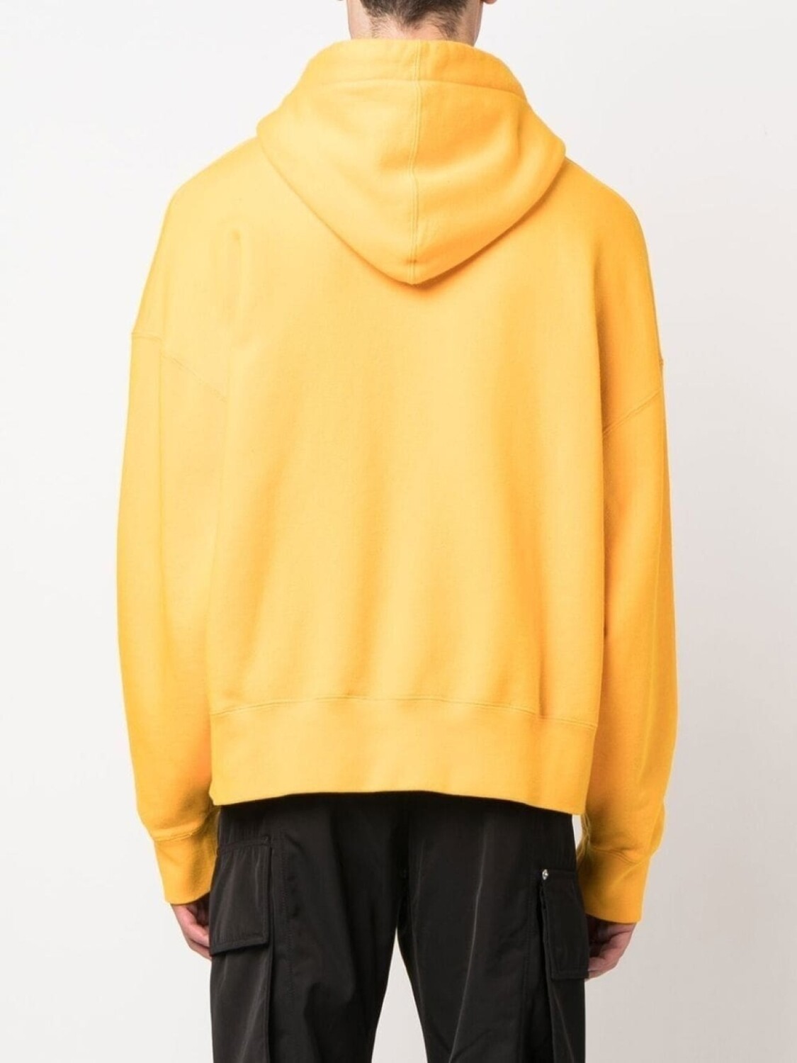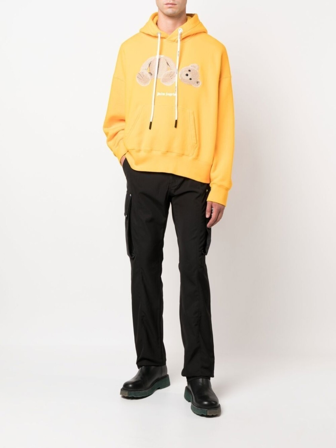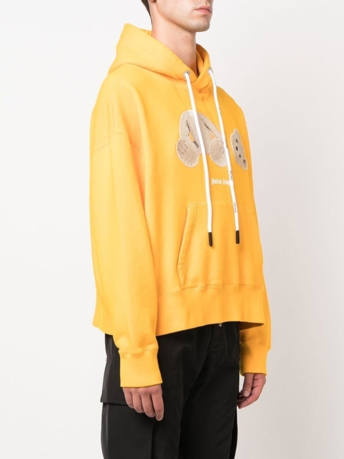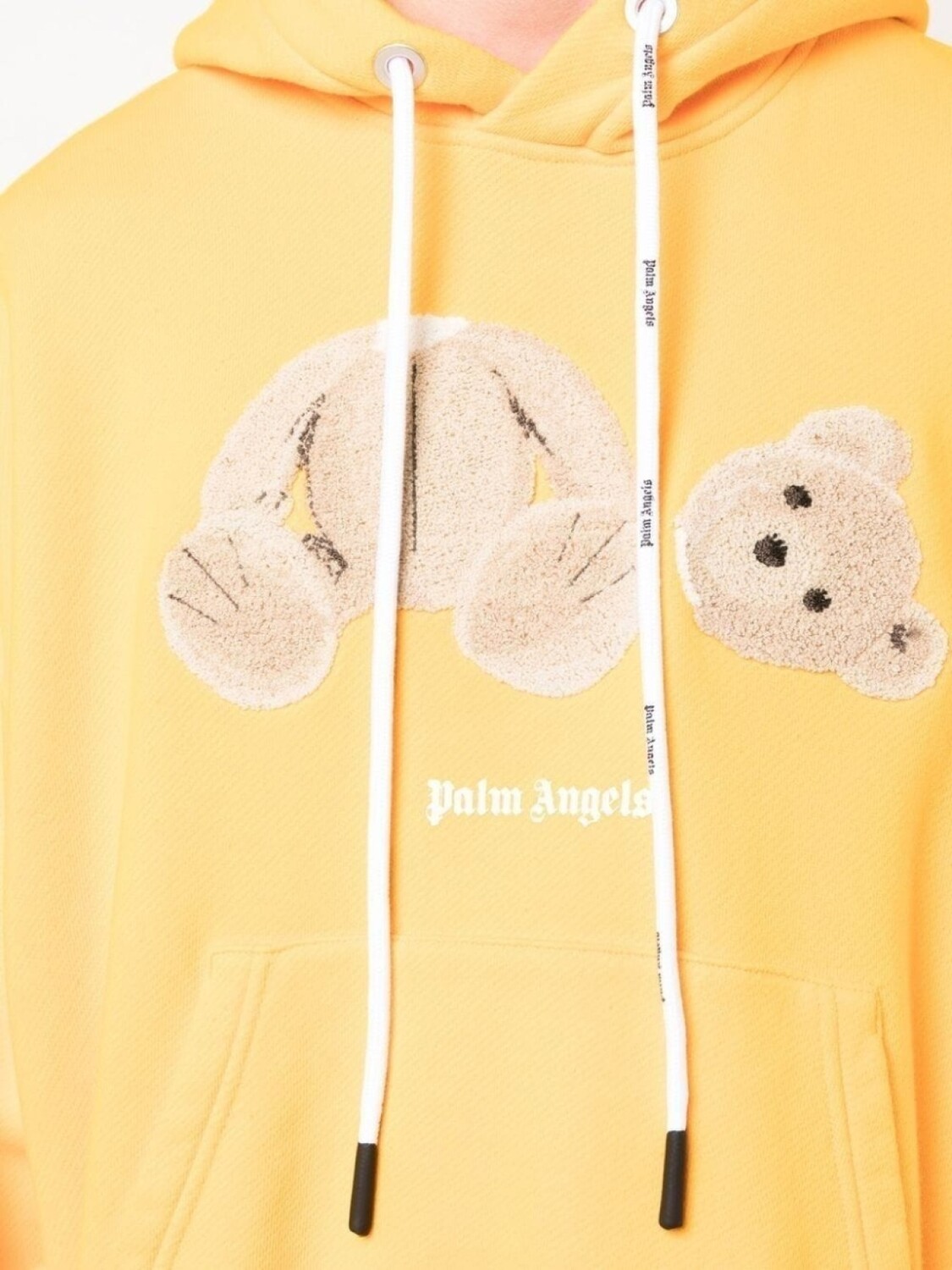 Желтый, хлопок, затягивающийся на шнурок капюшон, приспущенные плечи, длинные рукава, карман-муфта и принт с изображением плюшевого медведя.