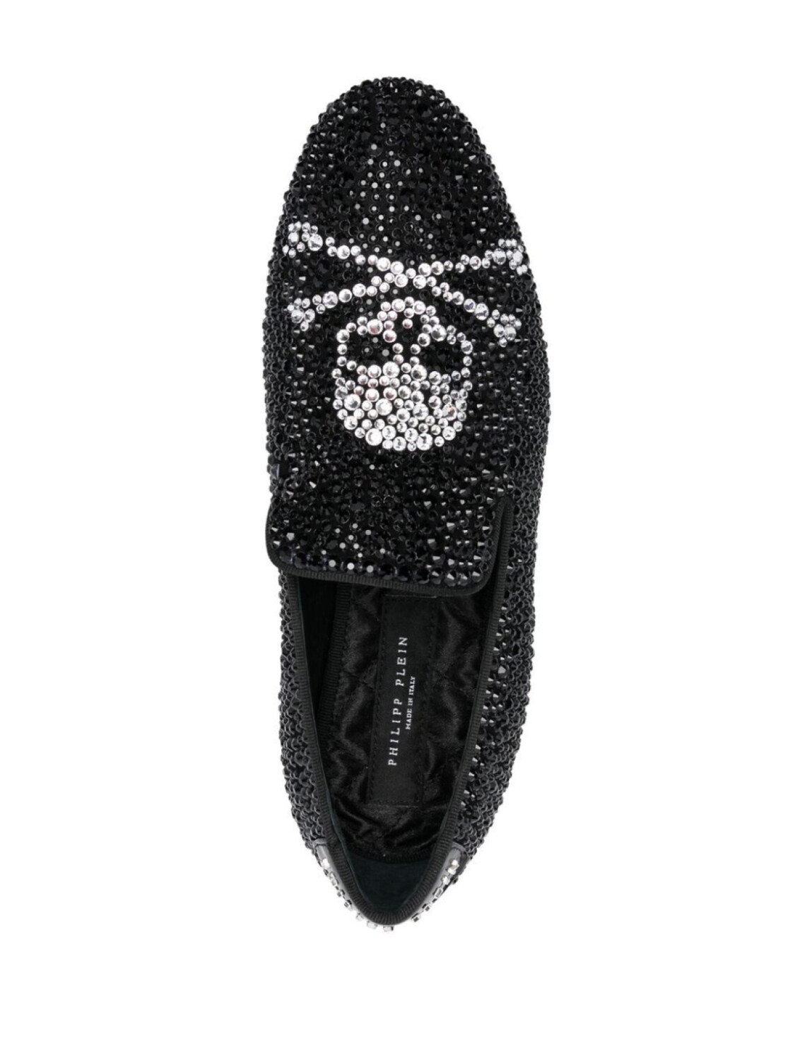 Черный, декор из стеклянных кристаллов, деталь в форме черепа, стелька с логотипом, модель без застежки и серебристый логотип.