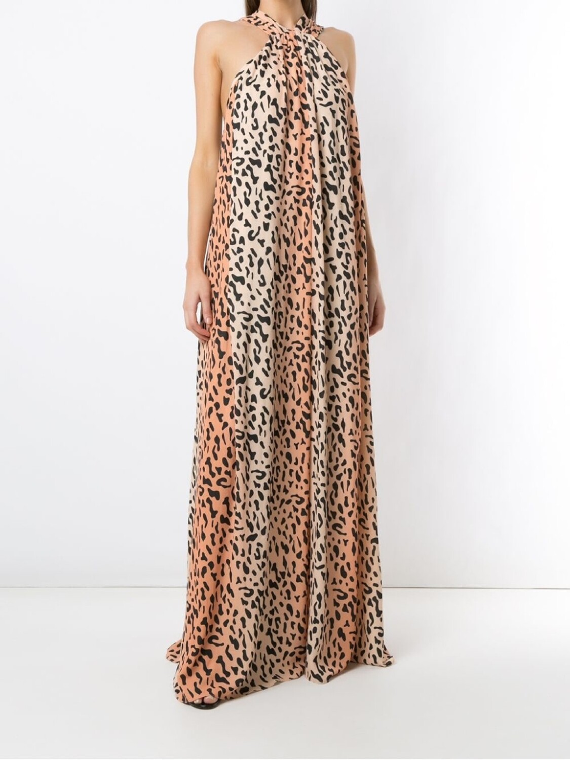Длинное платье Durban с принтом от Olympiah. Вырез-петля халтер, дизайн со сборкой, анималистический принт, застежка на завязке сзади, удлиненная модель и прямой крой.
