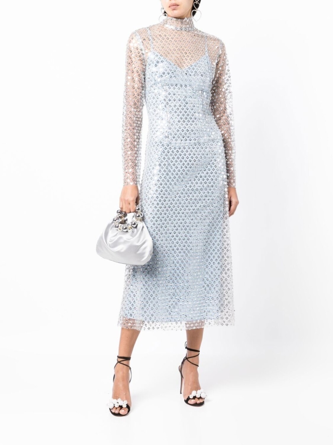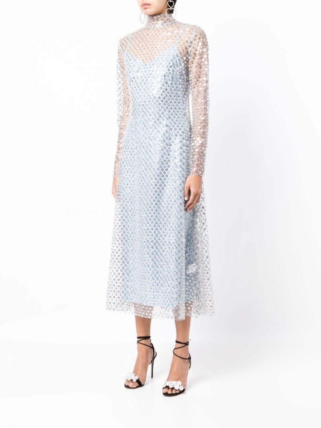 Нежно-голубой, украшение из пайеток, полупрозрачное покрытие, высокий воротник, длинные рукава и длина до середины икры.
