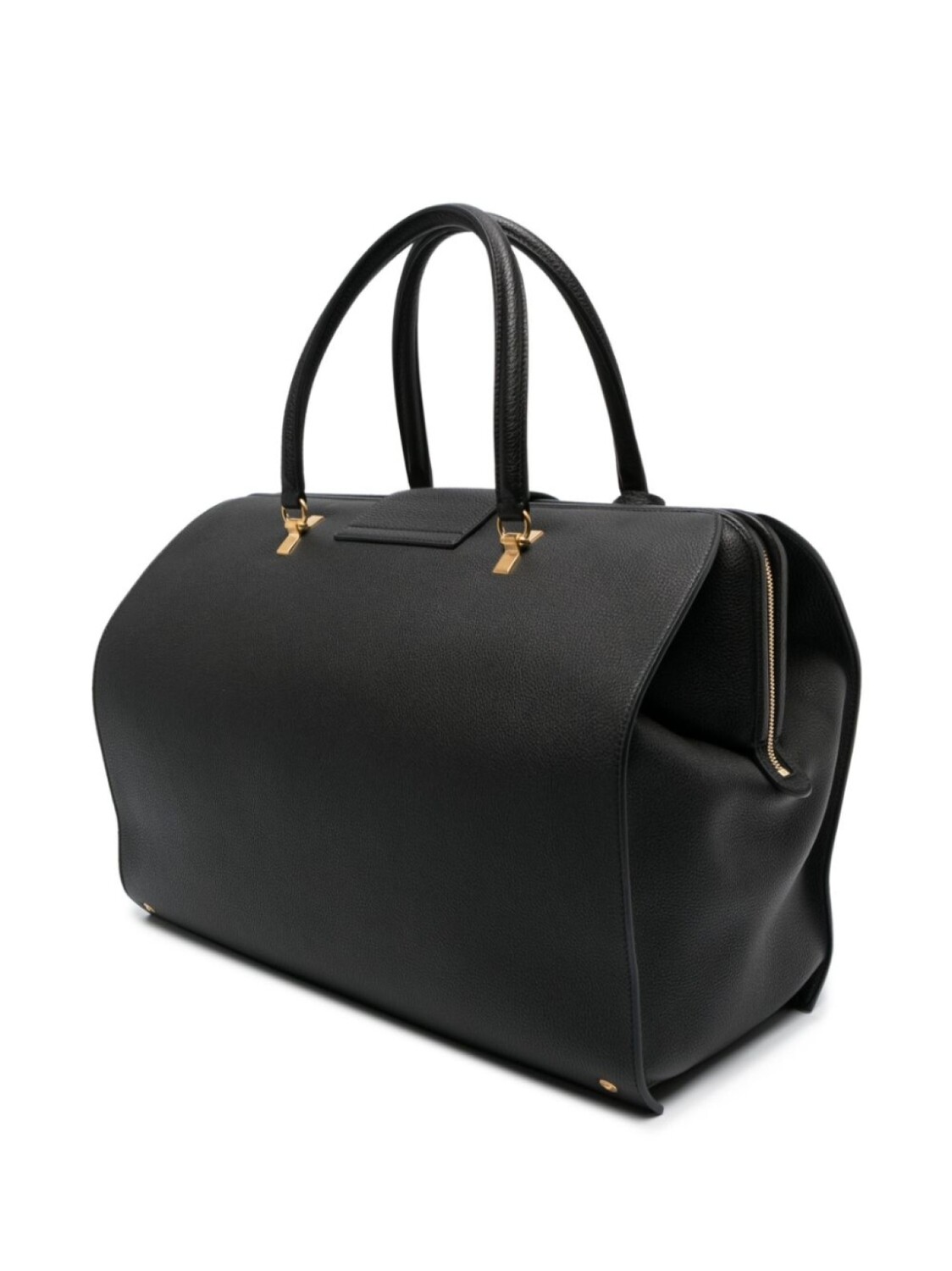 Черный, телячья кожа, знаковая деталь в полоску, застежка на молнии сверху, две верхние ручки, нашивка с логотипом внутри и подкладка в полоску RWB.