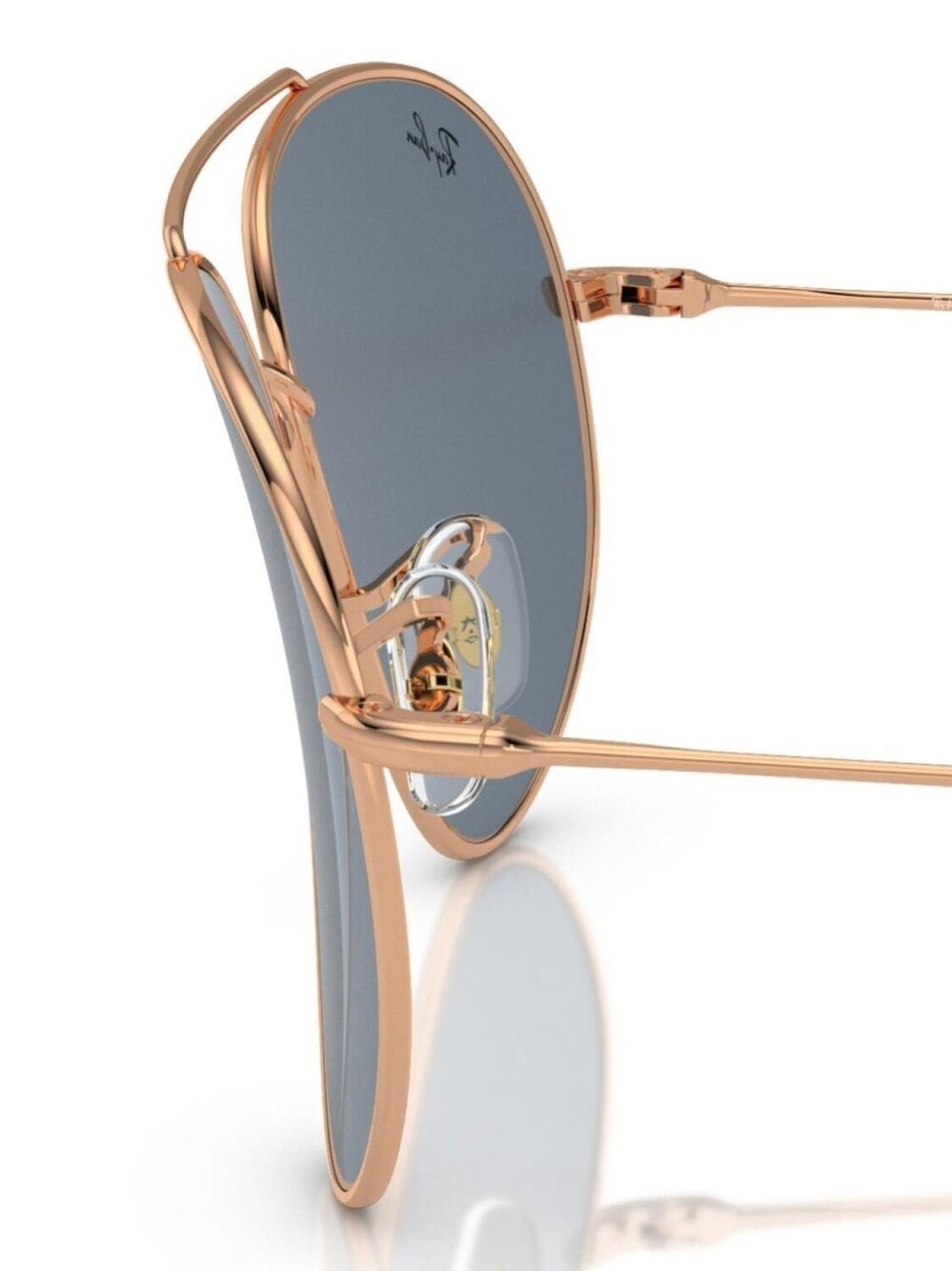 Фурнитура цвета розового золота, металл, оправа Ray-Ban Aviator, синие линзы, завышенный мост, прямые дужки и носоупоры. В комплект входит защитный чехол для очков.