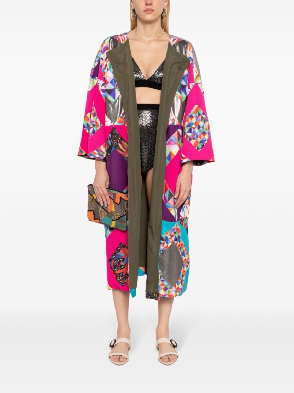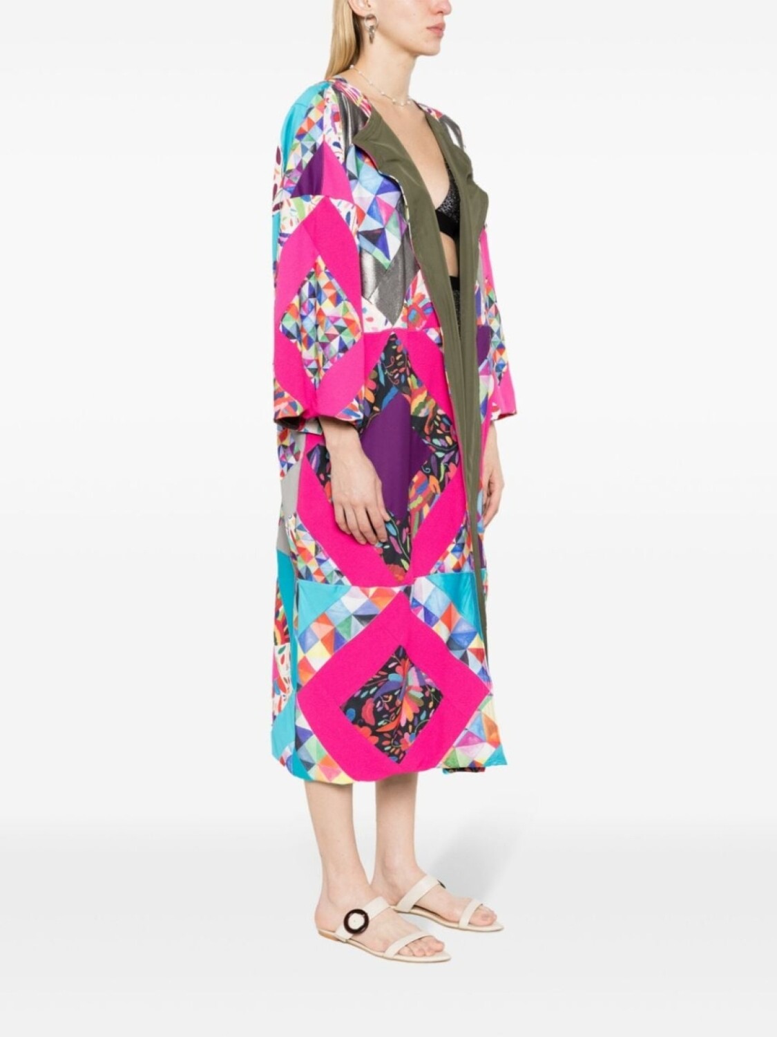 Ярко-розовый, разноцветный, смесовый хлопок, техника пэчворк, принт в стиле колор-блок, контрастные лацканы, модель без застежки, приспущенные плечи, длинные широкие рукава и прямой подол.
