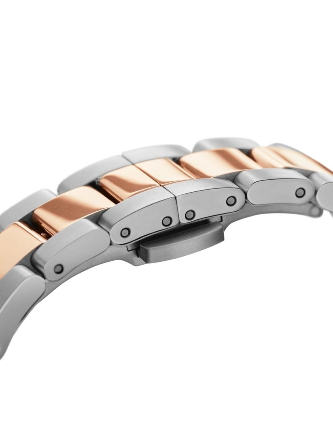 Серебристый, молочный, хрустальные часовые индексы, тонкие закругленные стрелки, кварцевый механизм, круглый корпус, браслет President и раскладная застежка.