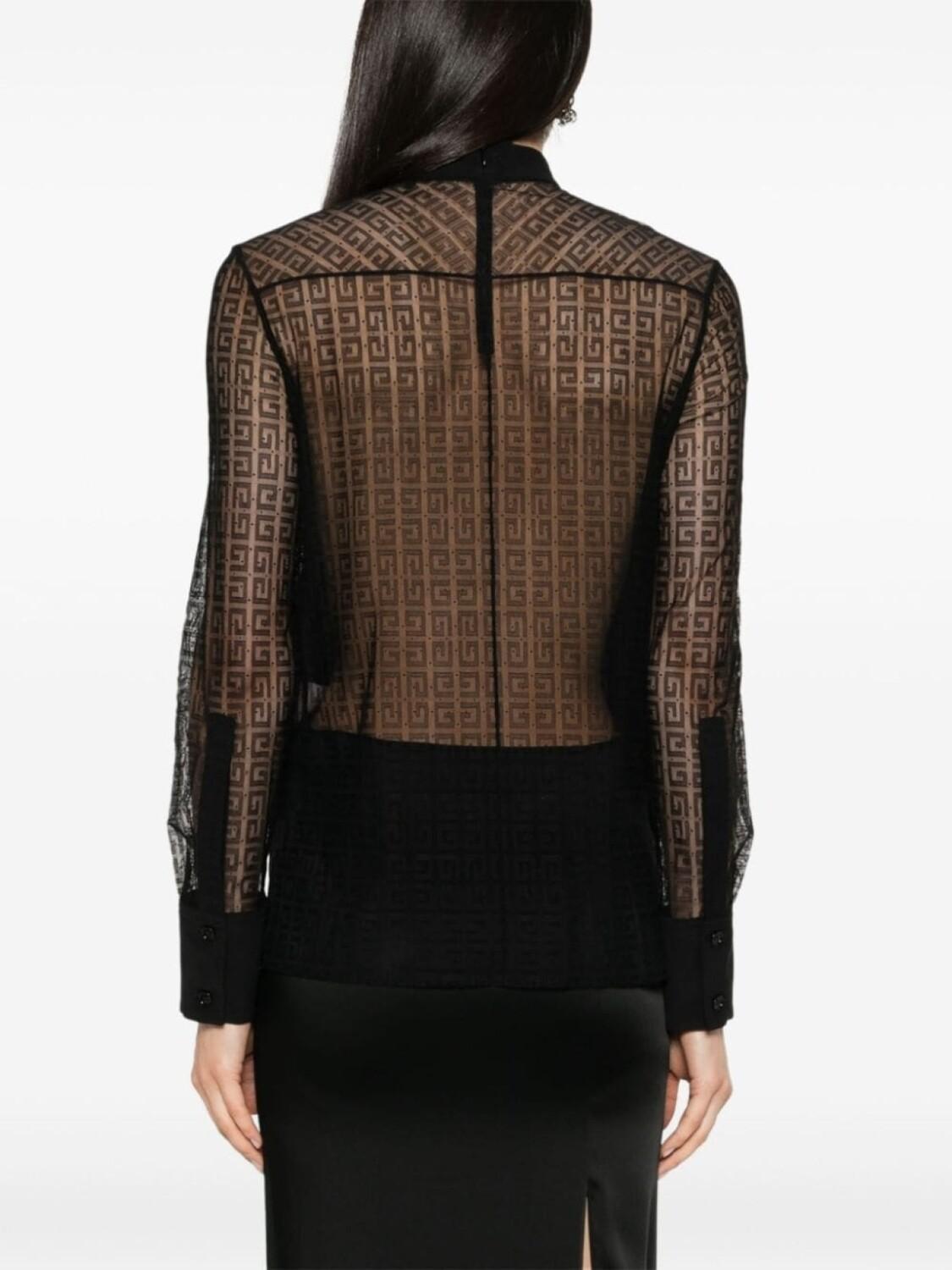 Черный, шелк, знаковый узор 4G, жаккард с монограммой, полупрозрачные вставки, воротник-стойка, длинные рукава, манжеты на пуговицах, короткая застежка на молнии и прямой подол.