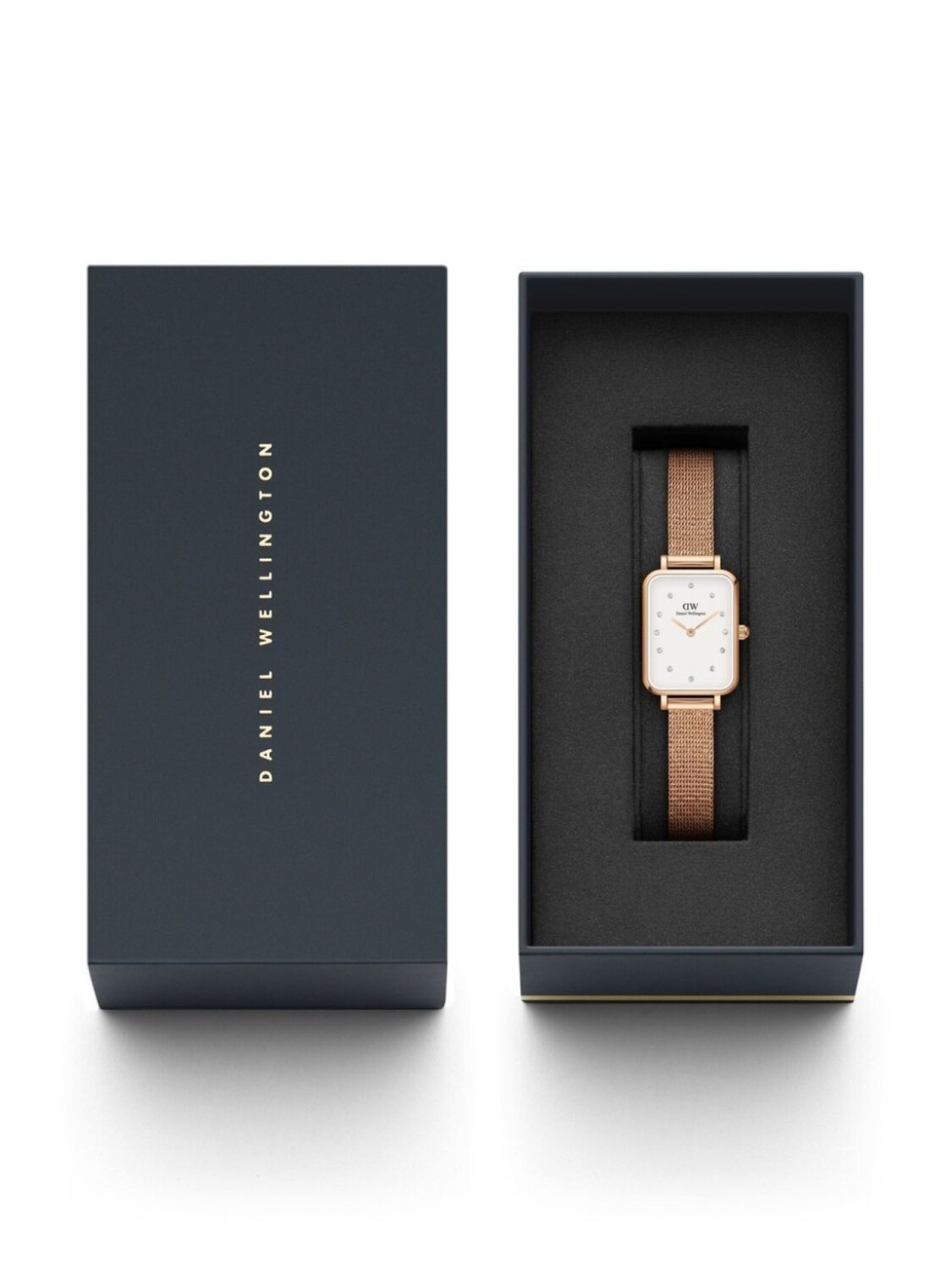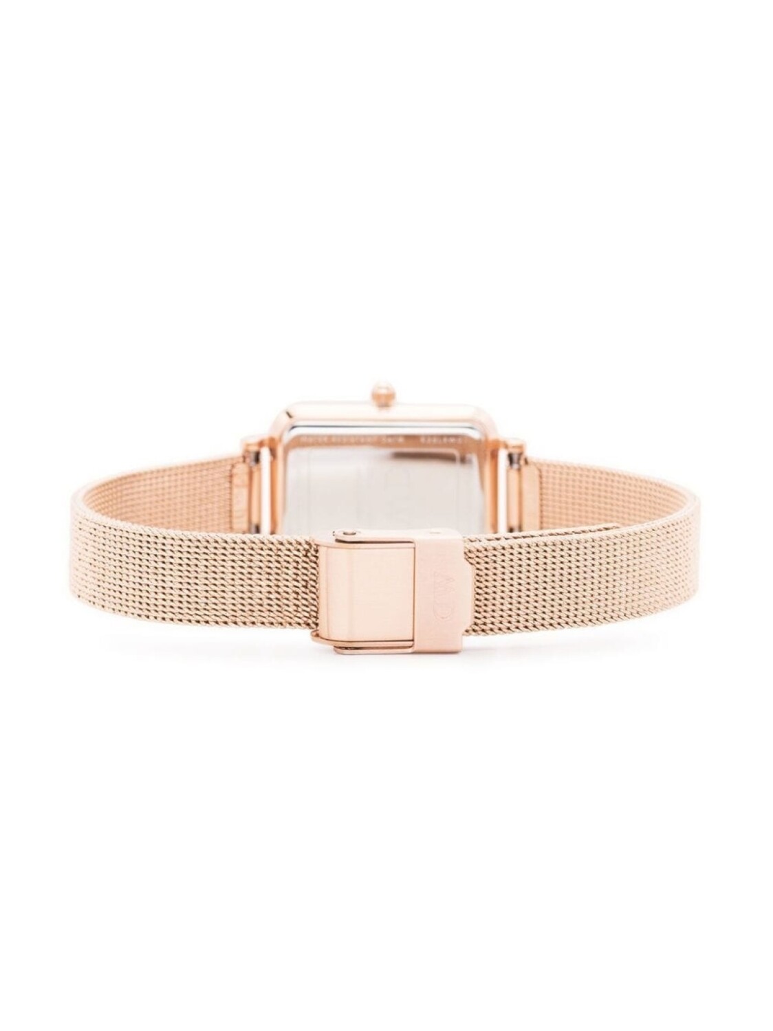 Нержавеющая сталь, фурнитура цвета розового золота, молочный, кварцевый механизм, хрустальные часовые индексы, логотип, прямоугольный корпус, прямоугольные вытянутые стрелки, плетеный браслет, сменный ремень, застежка-клипса и водонепроницаемость до 30 метров/3 АТМ.